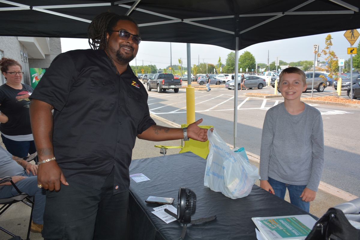 A volunteer thanks a youngster that has just made a donation of school supplies to Stuff the Bus on Sat July 24 2021 (Lee Erwin).