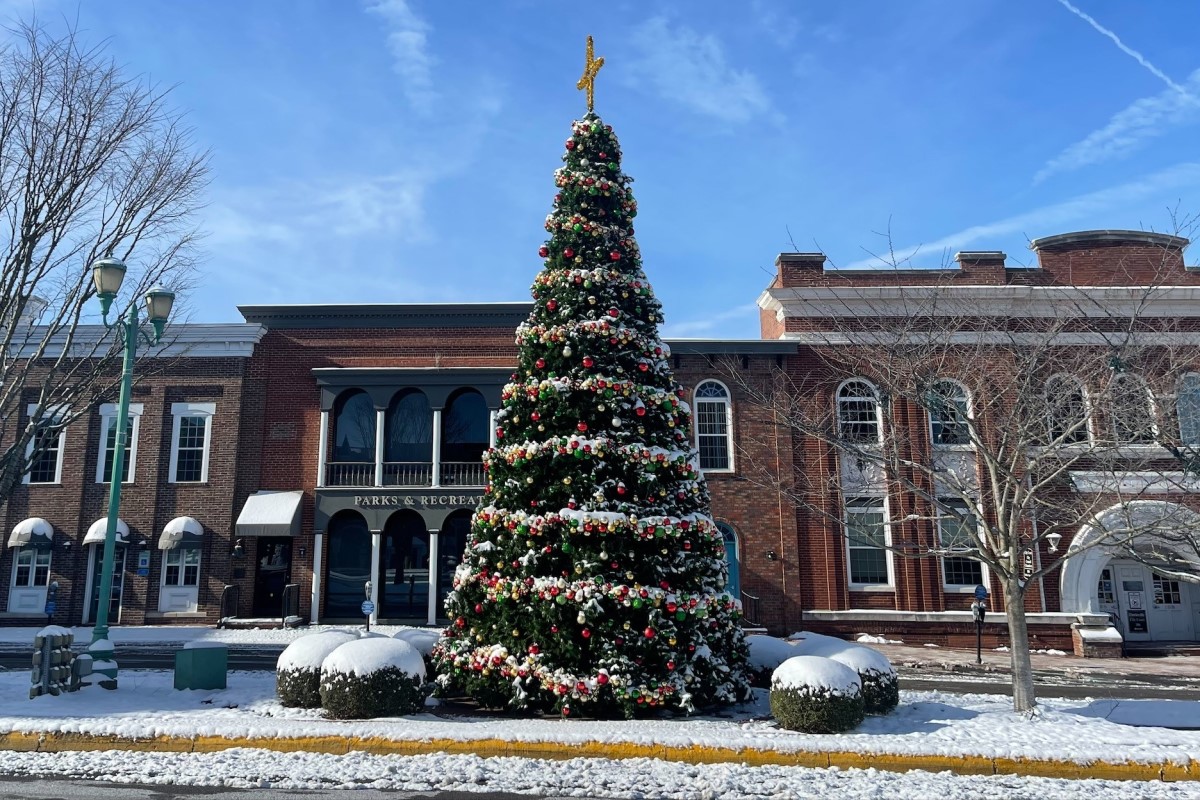 The Christmas tree at Public Square is naturally trimmed with actual snow on Friday morning, Jan. 7, 2022. (Keely Quinlan)