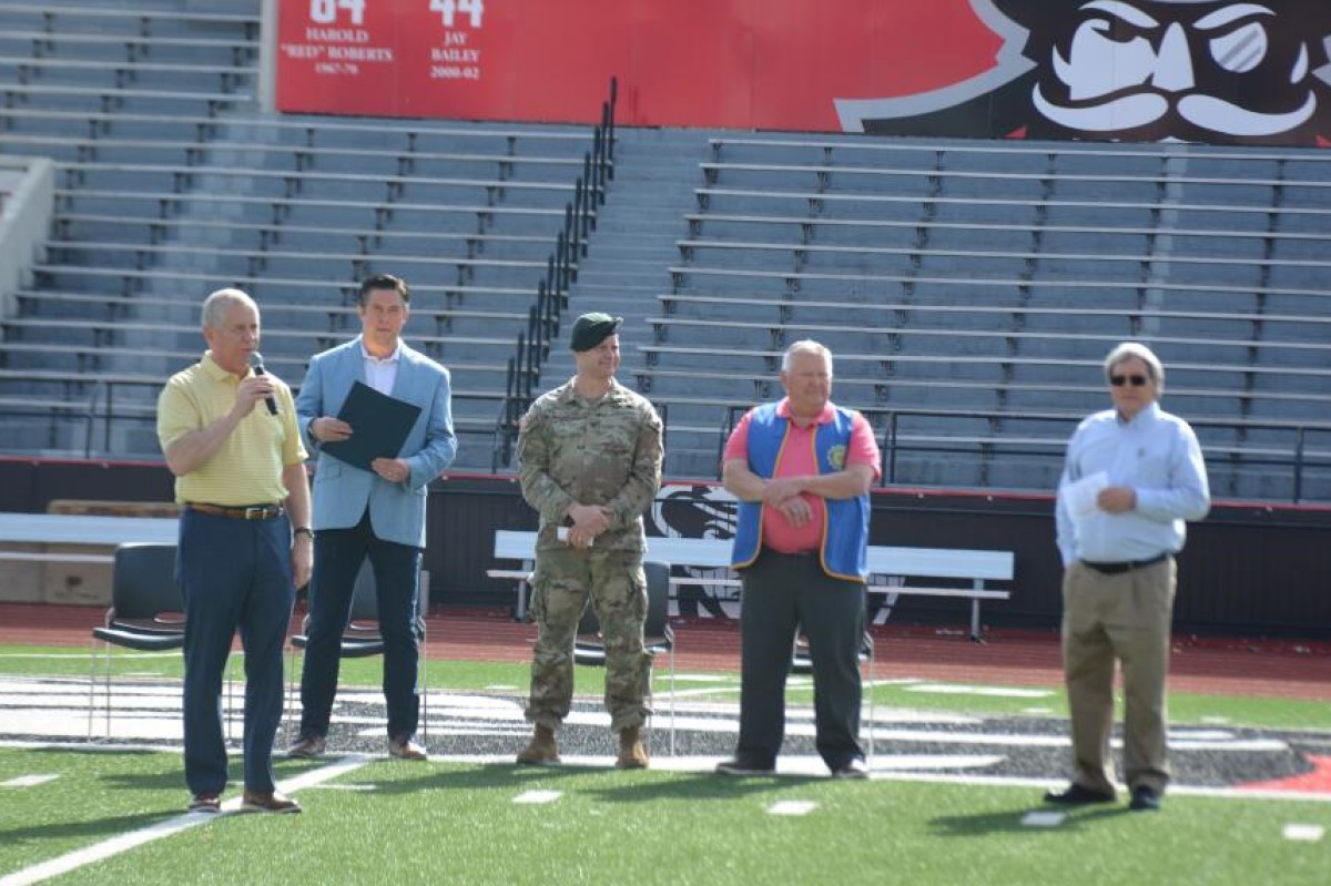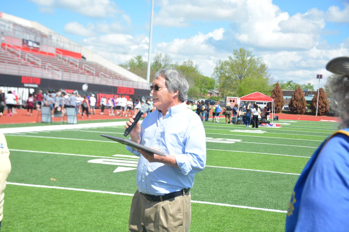 Lee Erwin is honored with the Civitan Servant’s Heart Award during the Greater Area 12 Special Olympics Track and Field Event at Austin Peay State University’s Fortera Stadium on April 14, 2023. (Jeff Matthews/Clarksville Now)