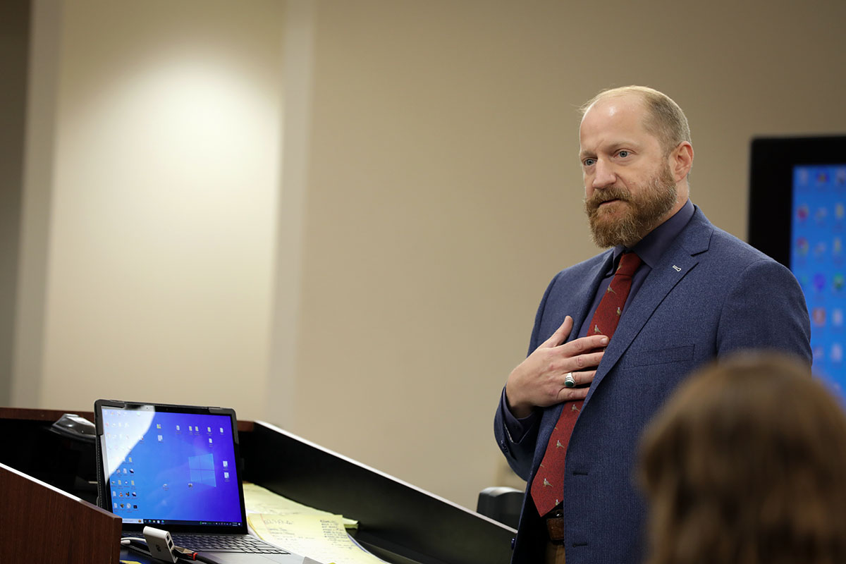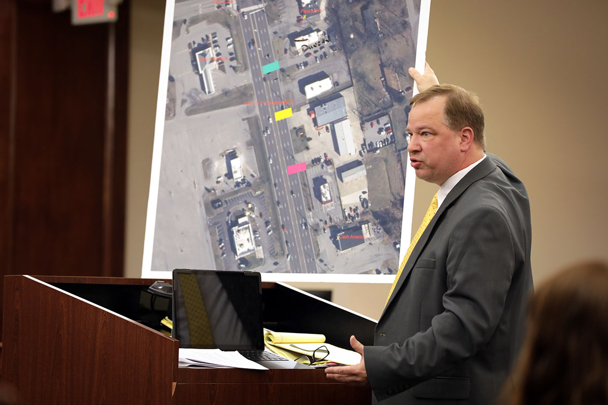 “I want ya’ll to look to your left, towards the witness box,” Meeks told the jury. “I want you to imagine there’s a long railroad stretching back hundreds of feet. You can see a train on that track, and you can tell it’s moving fast and it’s moving toward you, and you want to get to the other side of that railroad track.