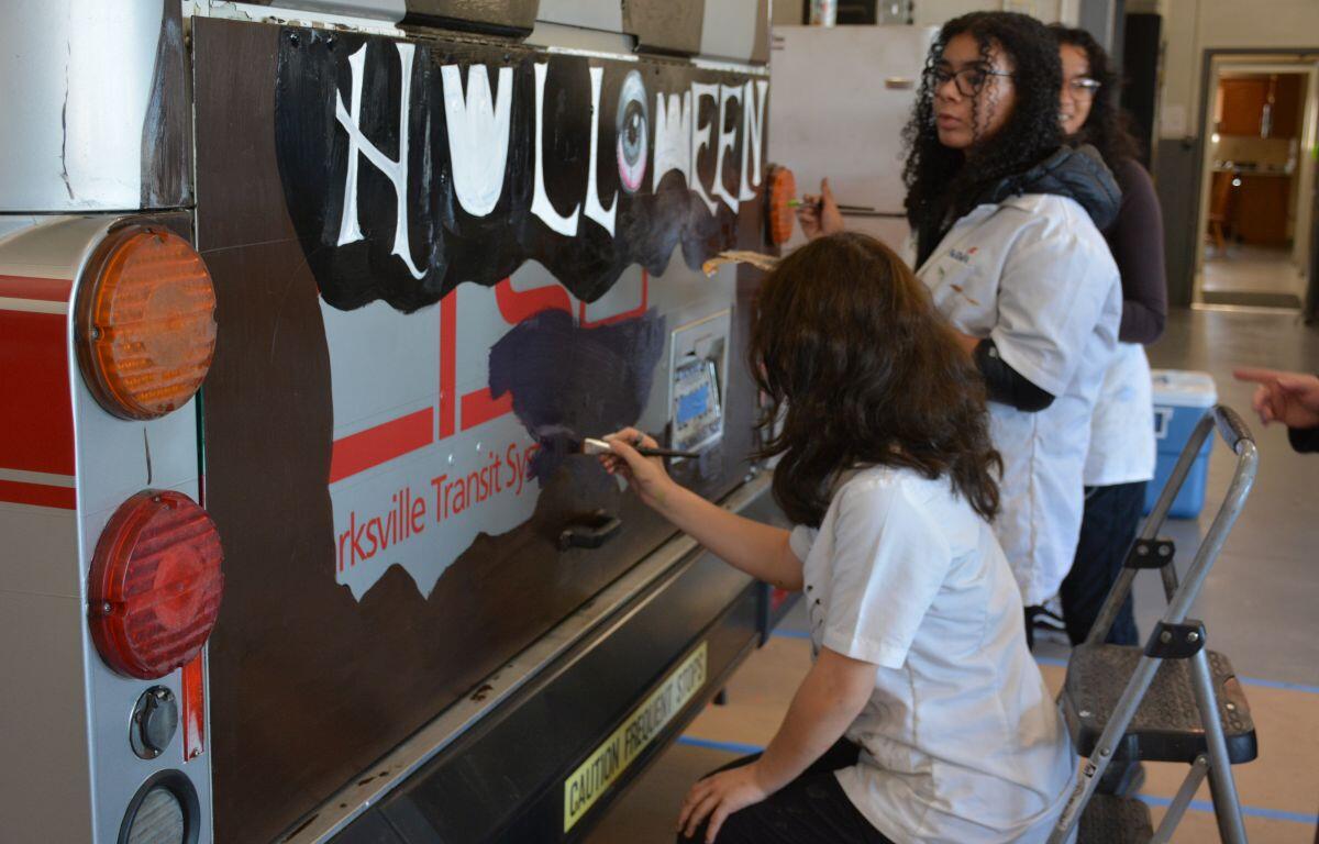 Northeast High School art students paint the Clarksville Transit System Spooky Special bus for Halloween on, Oct. 27, 2022. (Lee Erwin).