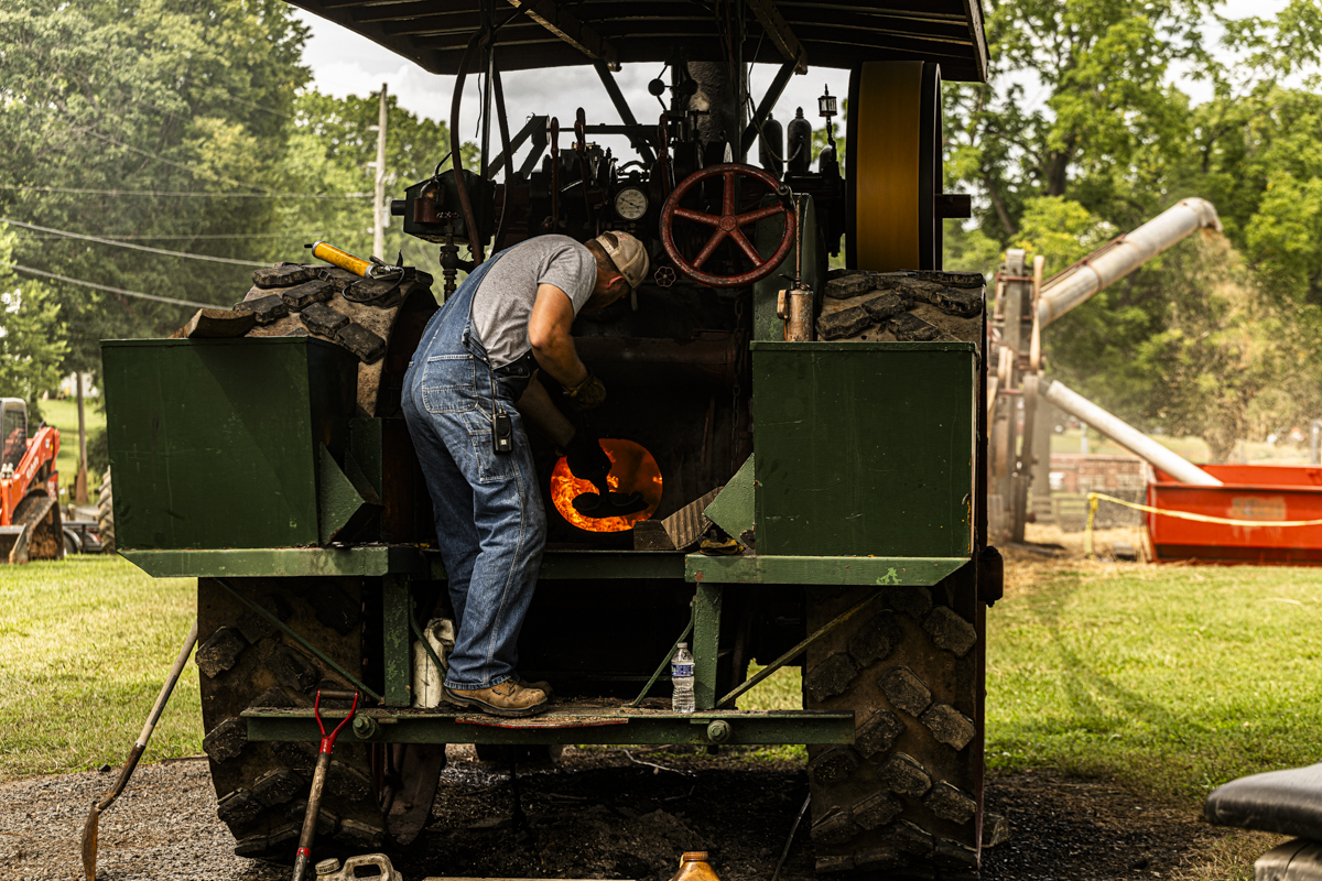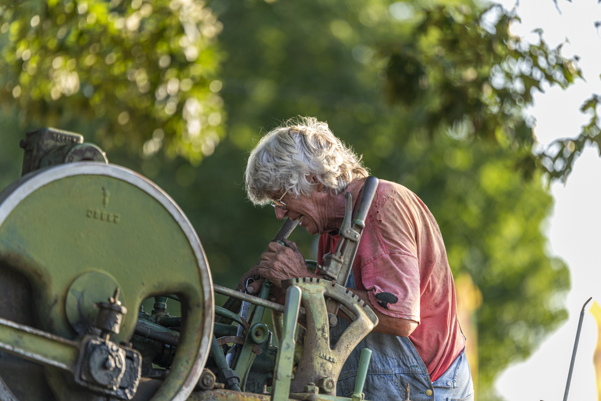 “Tree” working on his 1916 tractor at the Tennessee Kentucky Thresherman Association show on July 18, 2024. (Jeff Danault)