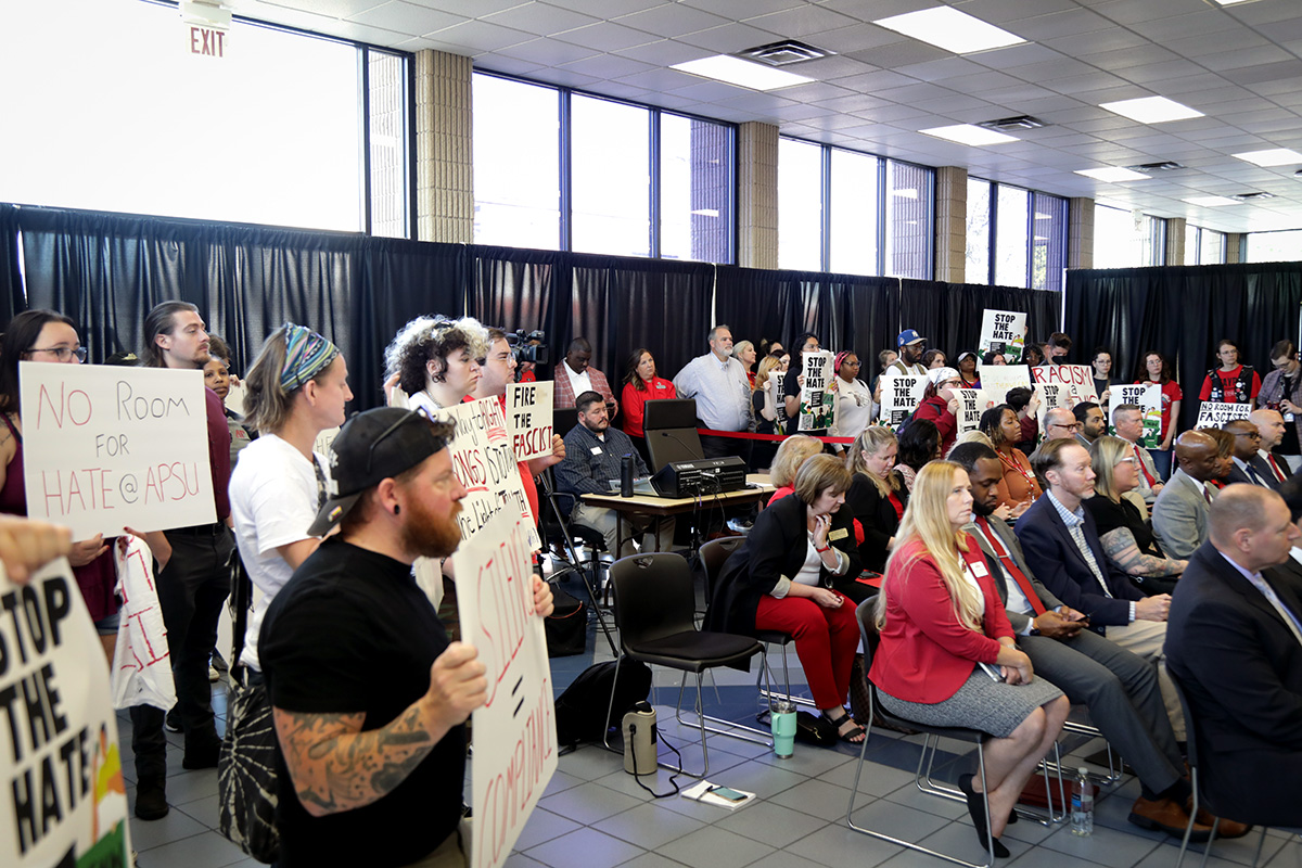 CLARKSVILLE, TN (CLARKSVILLE NOW) – Over 50 students gathered outside the Austin Peay State University Board of Trustees meeting on Friday to protest the recent hiring of a professor alleged to be affiliated with a website that promotes Nazism, racism and hate group activity.