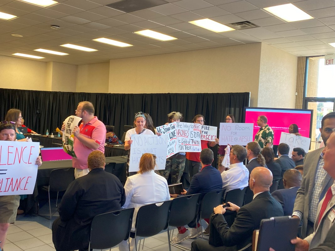 The board was holding its regularly scheduled public meeting relating to student affairs, business and finance. It became a standing-room-only gathering, with students both inside and outside the building holding up signs in protest. Students assembled around the board room and marched onto campus.