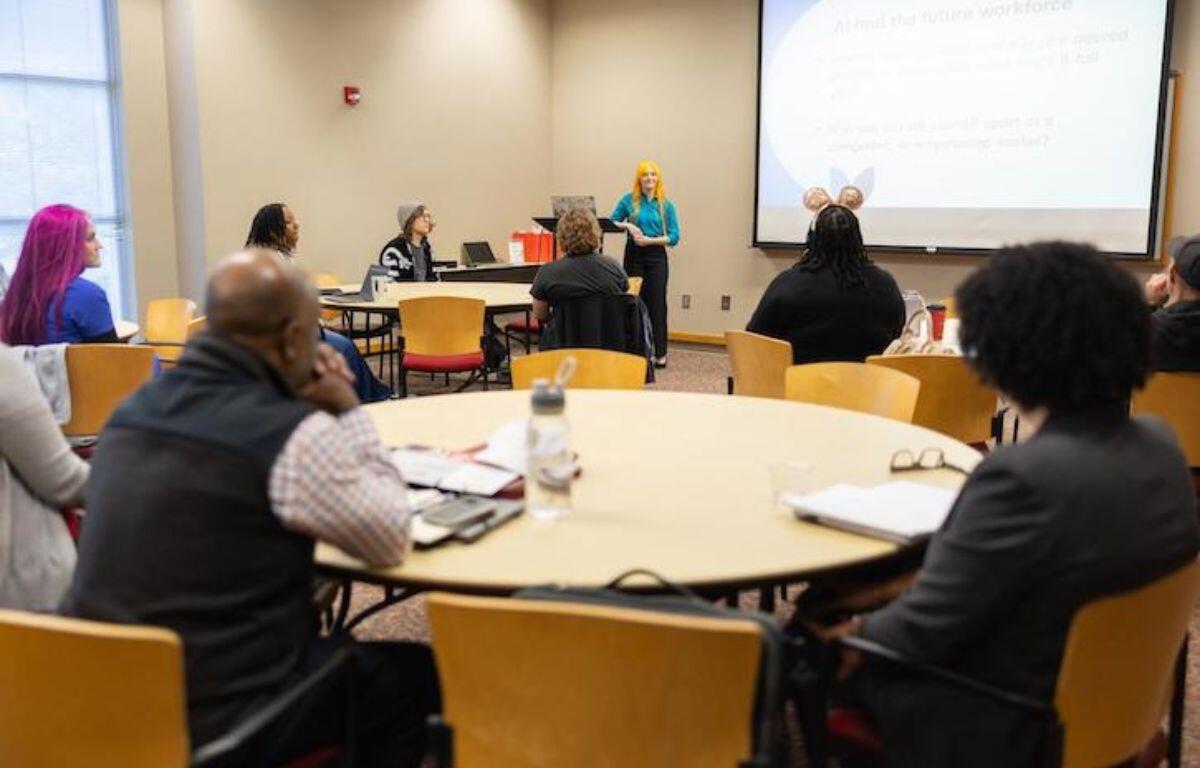 The daylong event drew participants from across campus for 16 interactive sessions and a keynote address exploring AI’s potential in education, research, and professional practice. Students who shared their expertise included Rhianna Loy, Sarah Ahlheit, and Camara Wilson.