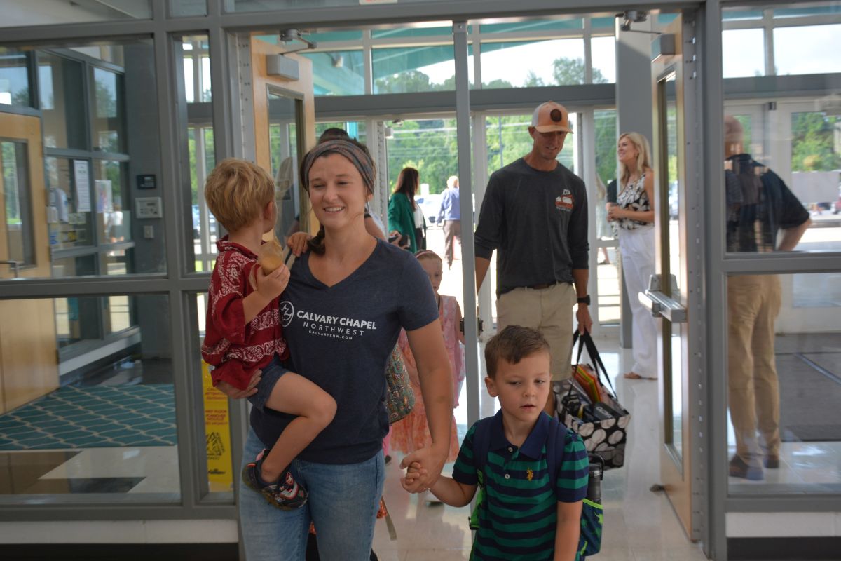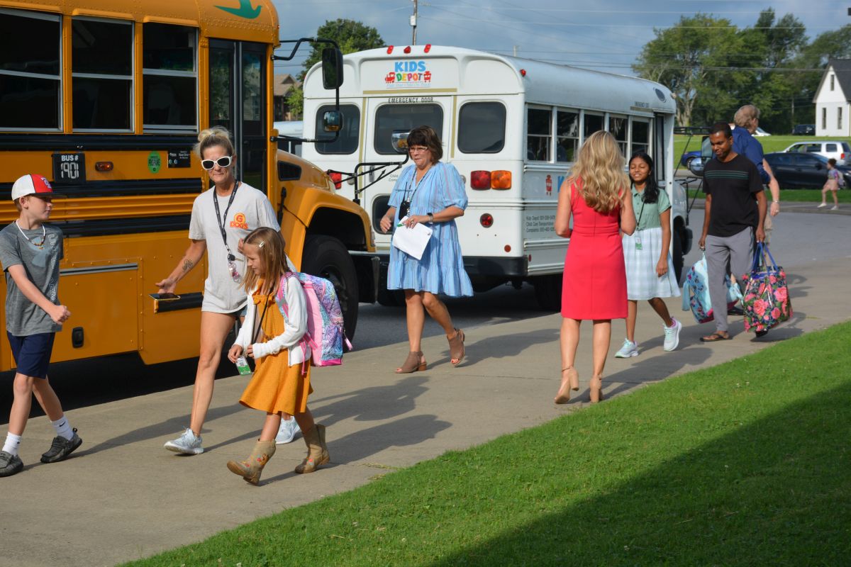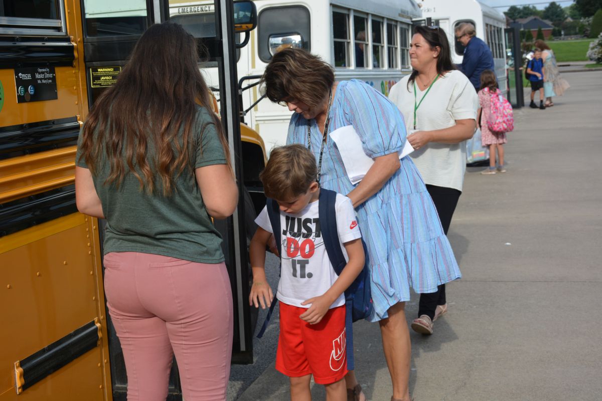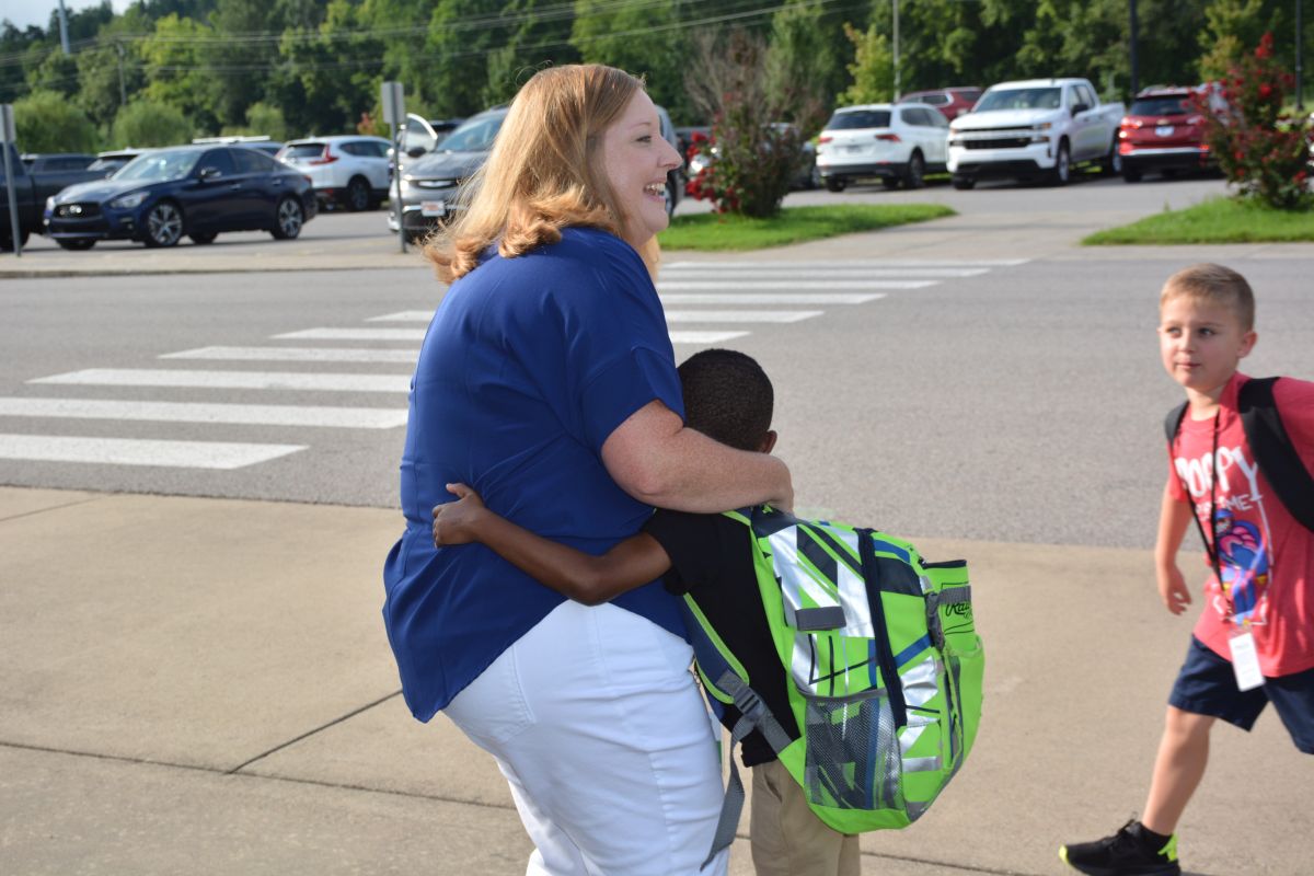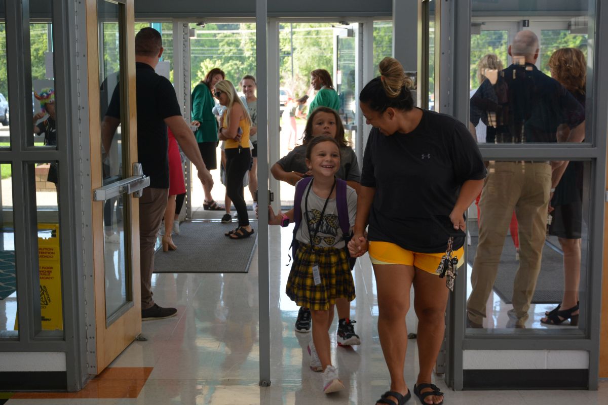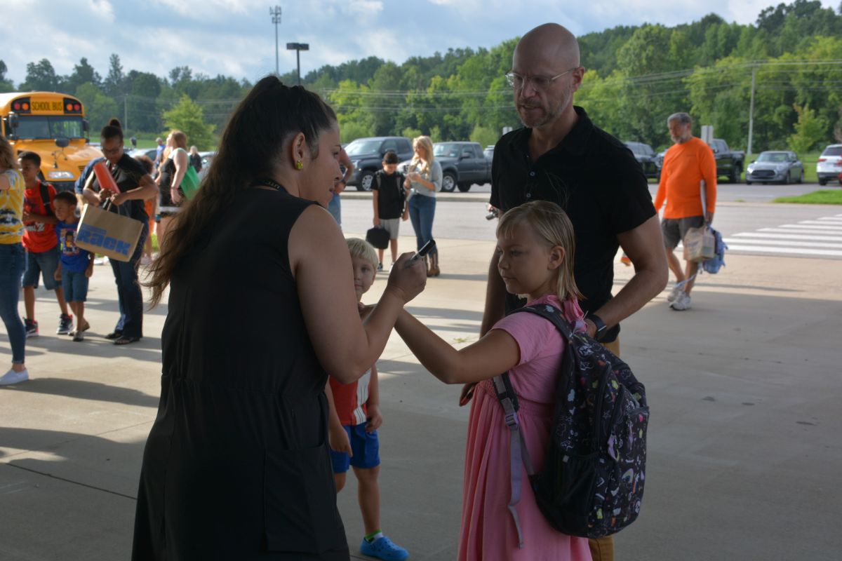 Students and parents are met by teachers and school officials at Carmel Elementary School for their first half-day of the 2023-24 school year of Clarksville-Montgomery County Schools, on Aug. 7, 2023. (Lee Erwin)