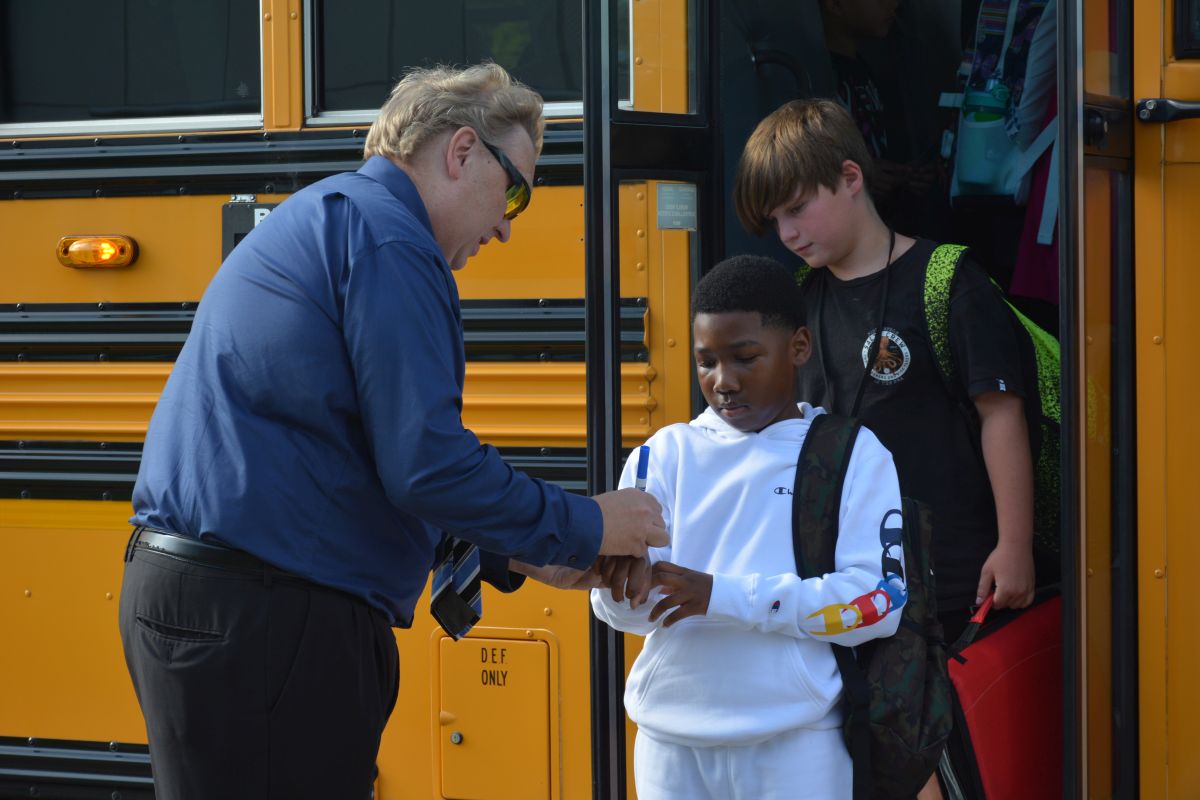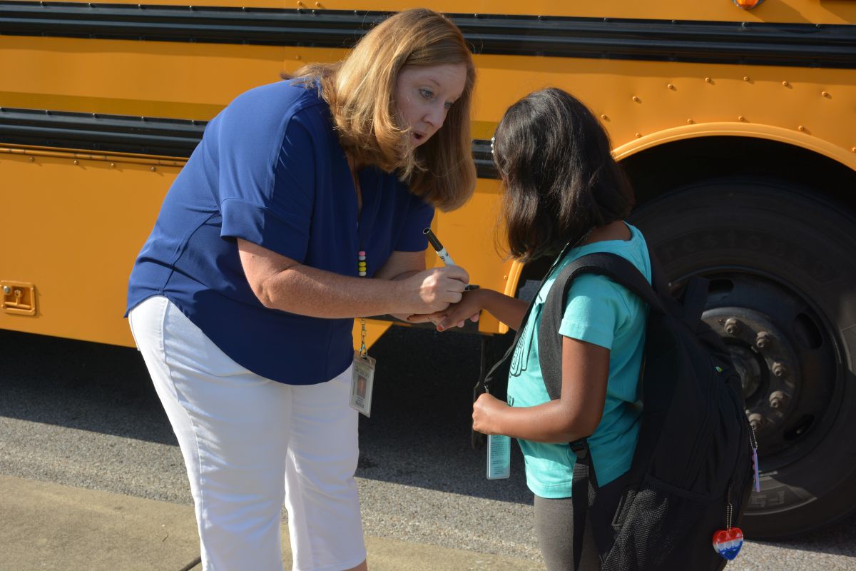 School System Director Dr. Jean Luna-Vedder was joined by School Board members, school staff and officials, at both Kirkwood High School on Rossview Road and Carmel Elementary School on Sango Road. For this first day, to help them remember, teachers marked the hand of each student with a “C” if they arrived by car, a “W” if they walked, or their bus number if they rode a school bus.