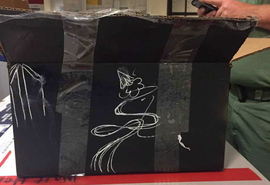 The package is a black box with what appeared to be a missile symbol on the box. The bomb squad approached the package with a portable x-ray machine to see the contents inside. When they checked the image they did not see any wires or objects that would be considered dangerous.