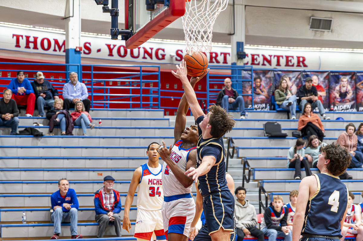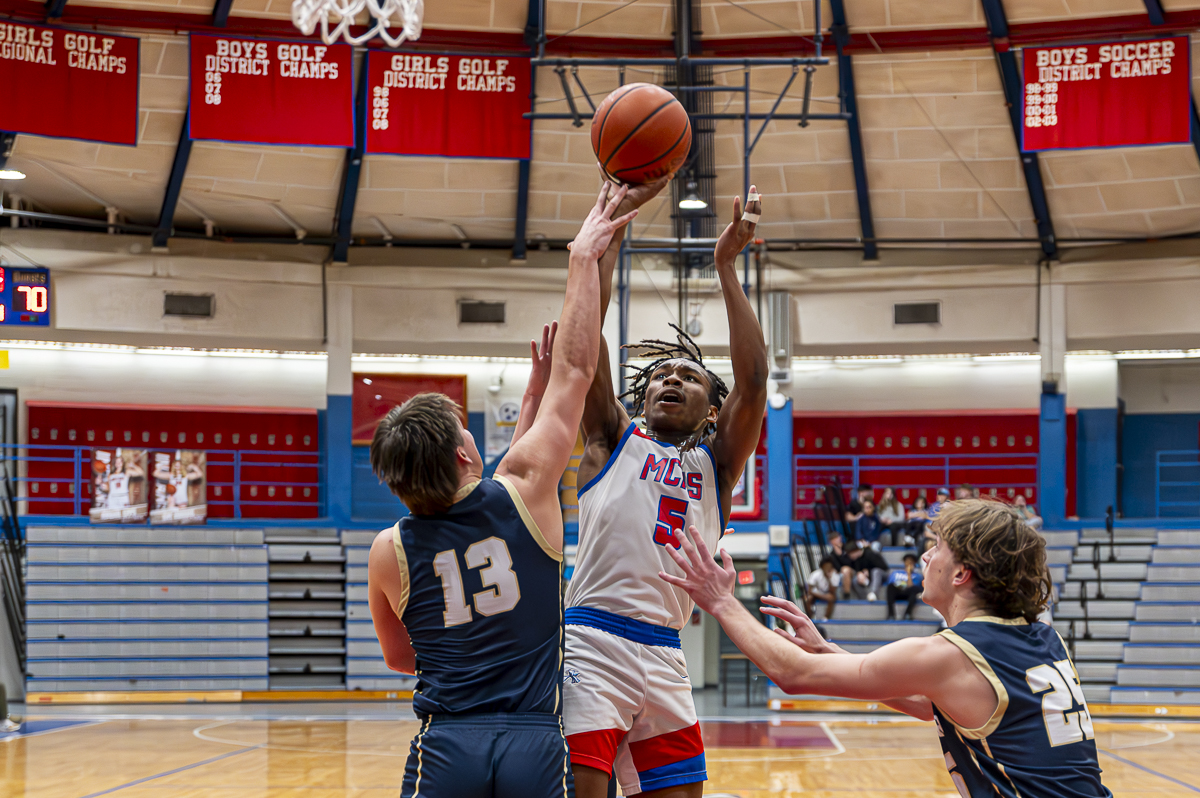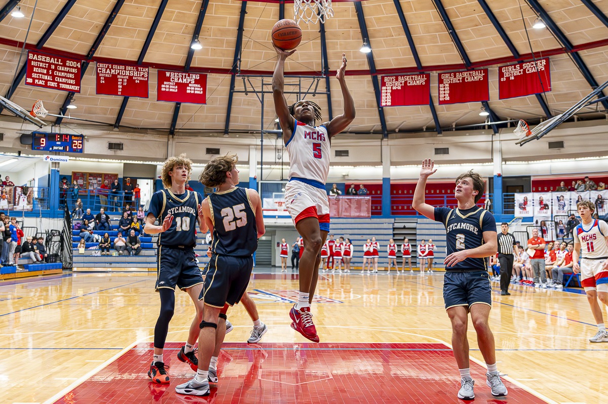 #5 Christian Fox of the Montgomery Central Indians with a layup against Sycamore High School on February 7, 2025 (Jeff Danault)