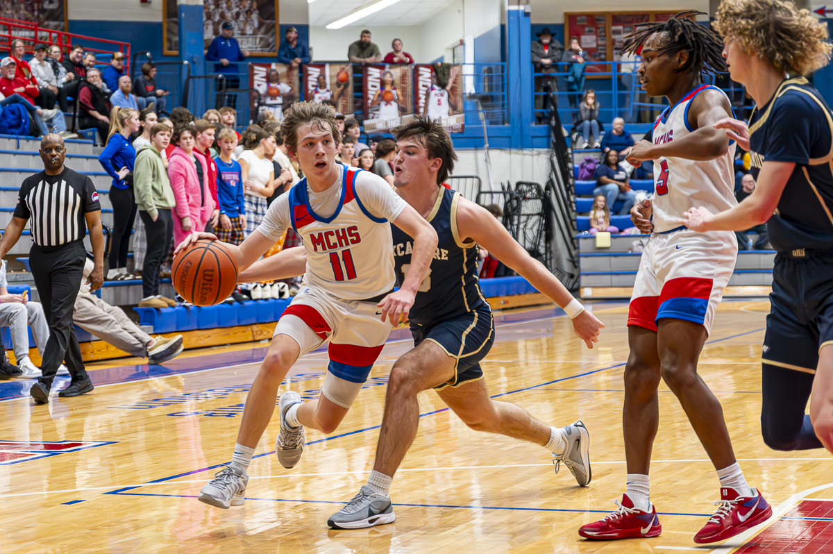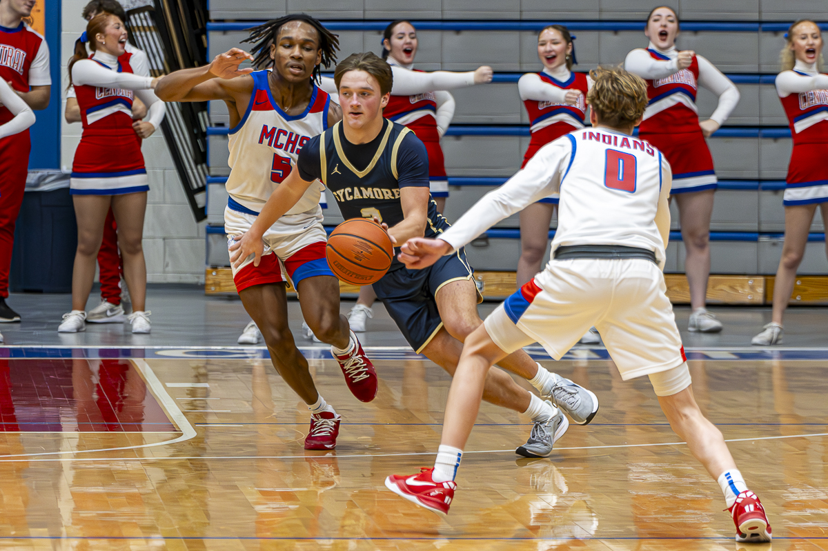 #11 Bryson Azarigian of the Montgomery Central Indians meets heavy defense from Sycamore High School on February 7, 2025 (Jeff Danault)