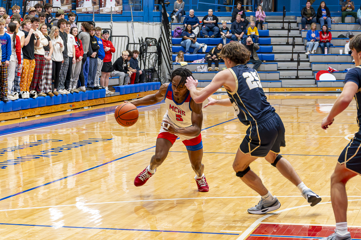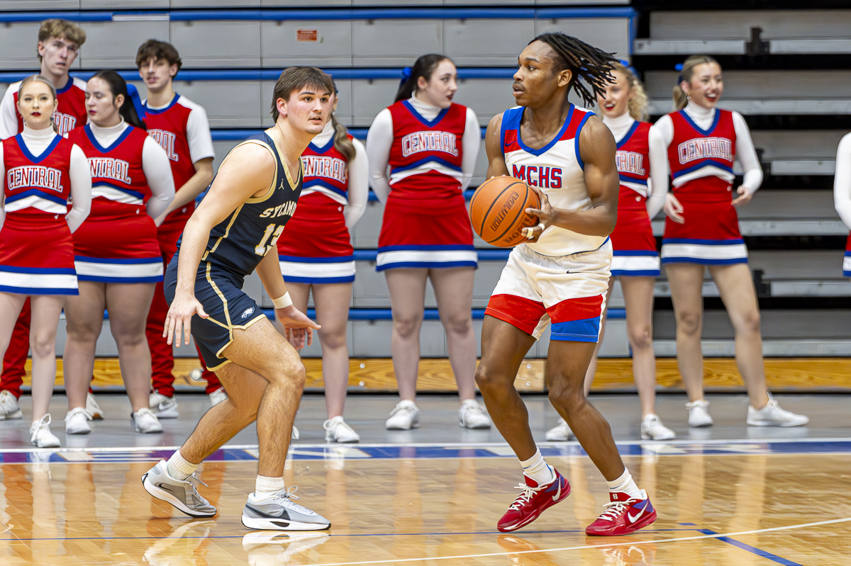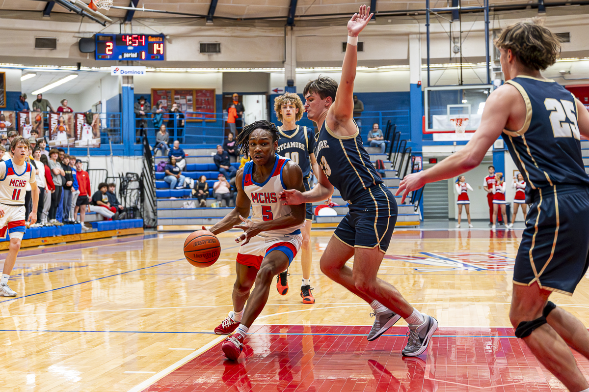 #5 Christian Fox of the Montgomery Central Indians moves through the defense of Sycamore High School on February 7, 2025 (Jeff Danault)
