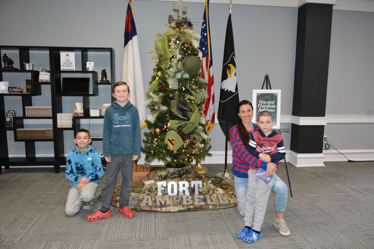 A Fort Campbell Family poses with one of the decorated Christmas trees at the Tour of Trees at First Baptist Clarksville on Nov. 30, 2023. (Lee Erwin)