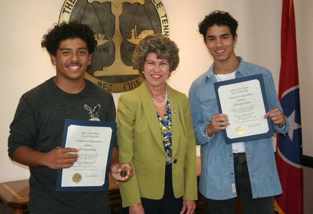 CLARKSVILLE, Tenn. (CLARKSVILLENOW) – Mayor Kim McMillan presented Certificates of Appreciation honoring two young men for their courageous actions in the aid of fellow citizen who was trapped under a toppled lawn tractor.