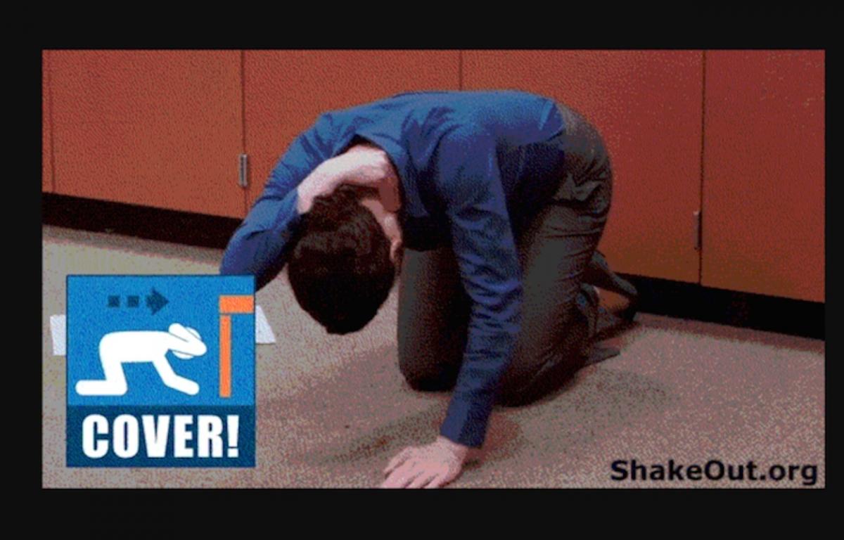 During the ShakeOut drill, participants will practice the Drop, Cover, and Hold On technique, which is the proper self-protection measure in an earthquake. The technique’s actions are: