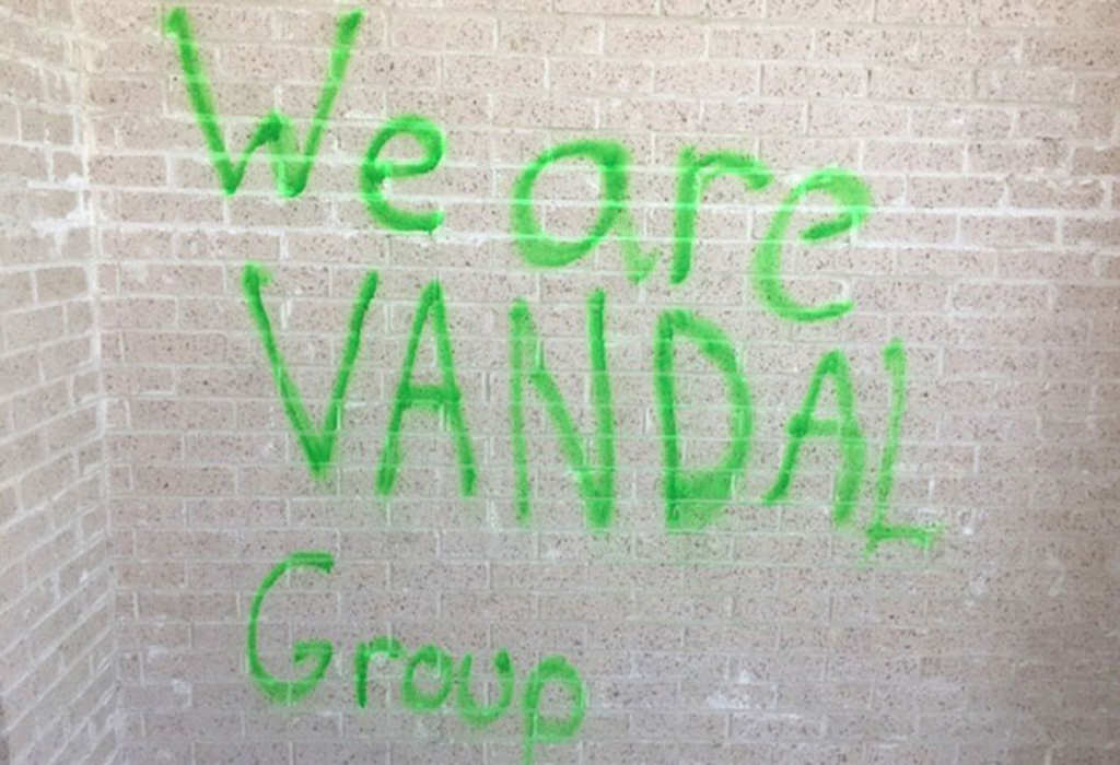 Green graffiti messages with expletives were spray-painted on a side door, on the back of the building and on an outdoor basketball court.