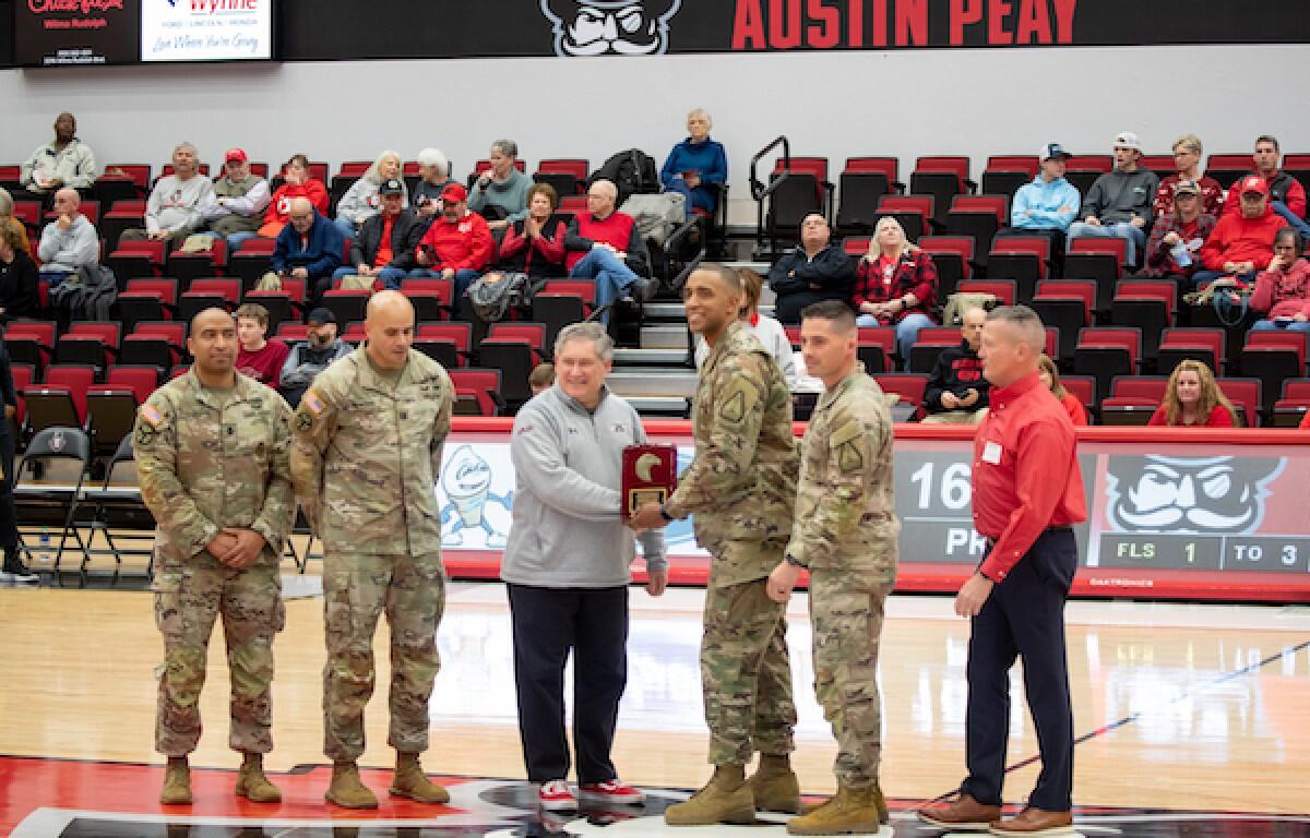 CLARKSVILLE, TN – On Feb. 2, Austin Peay State University Athletics hosted its Military Appreciation Day during the men’s basketball game, and during a break in the action, the Tennessee National Guard (TNG) took the court for a special presentation.