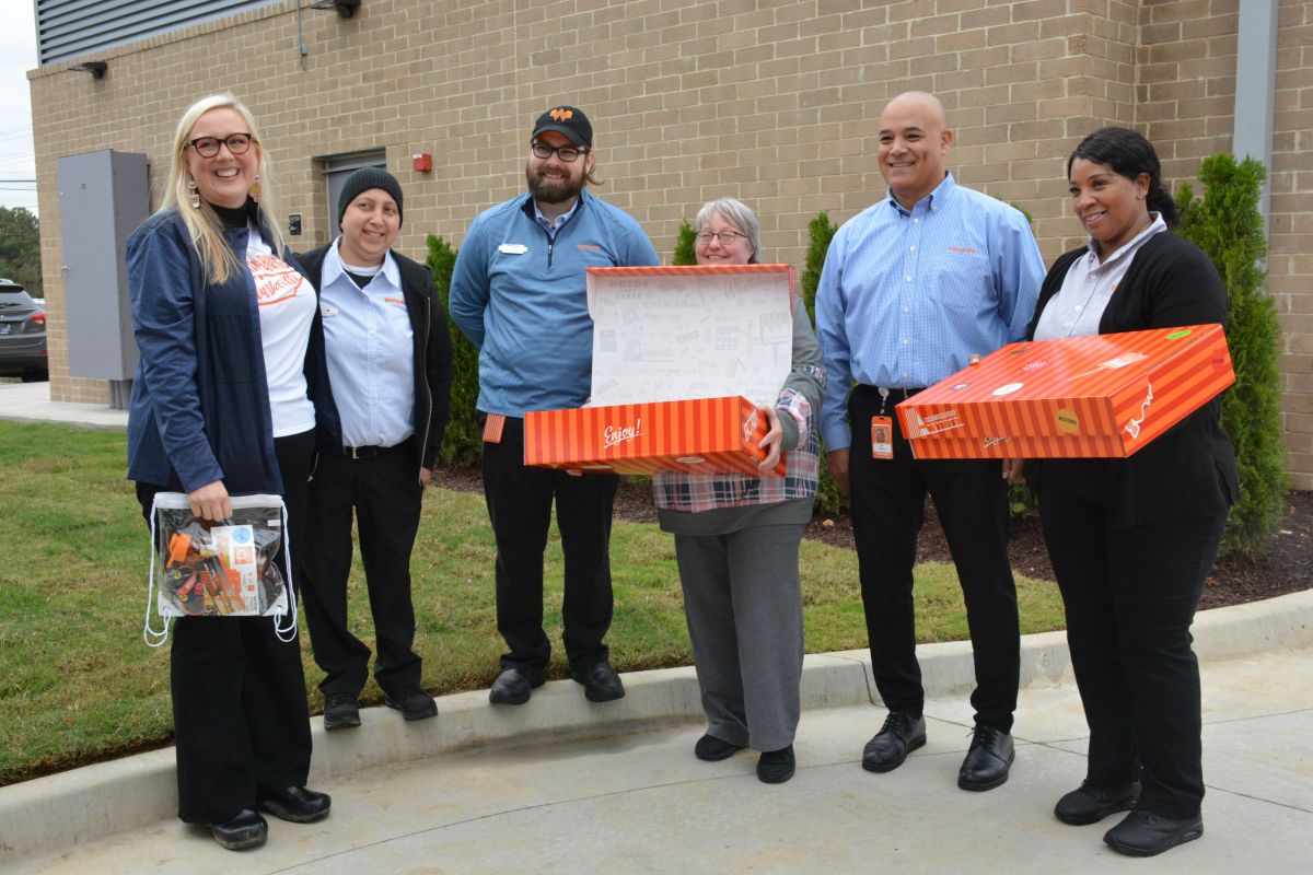 The line for the drive-thru was long, stretching through the restaurant parking lot around nearby Winn Way and down Fire Station Road. Whataburger team members passed out Whataburger prizes to many of the vehicles in line.