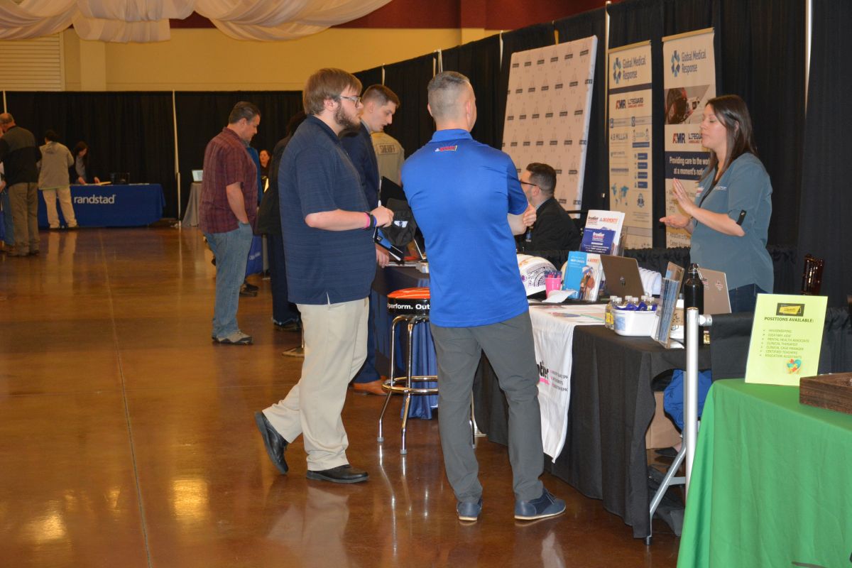 Employers fill Valor Hall in Oak Grove offering employment opportunities to job seekers on the first day of the Mega Job Fair with 5 Star Media on, Apr. 12, 2022. (Lee Erwin).
