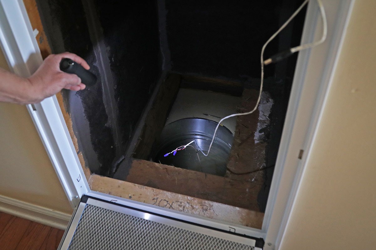 While Thomas swam down the street to go retrieve their garbage can, Kristen invited Clarksville Now in for a tour of her home. She stopped by the air handler filter and pulled it open to shine a light inside, revealing an air duct full of stagnant, murky water in their recently replaced HVAC system.