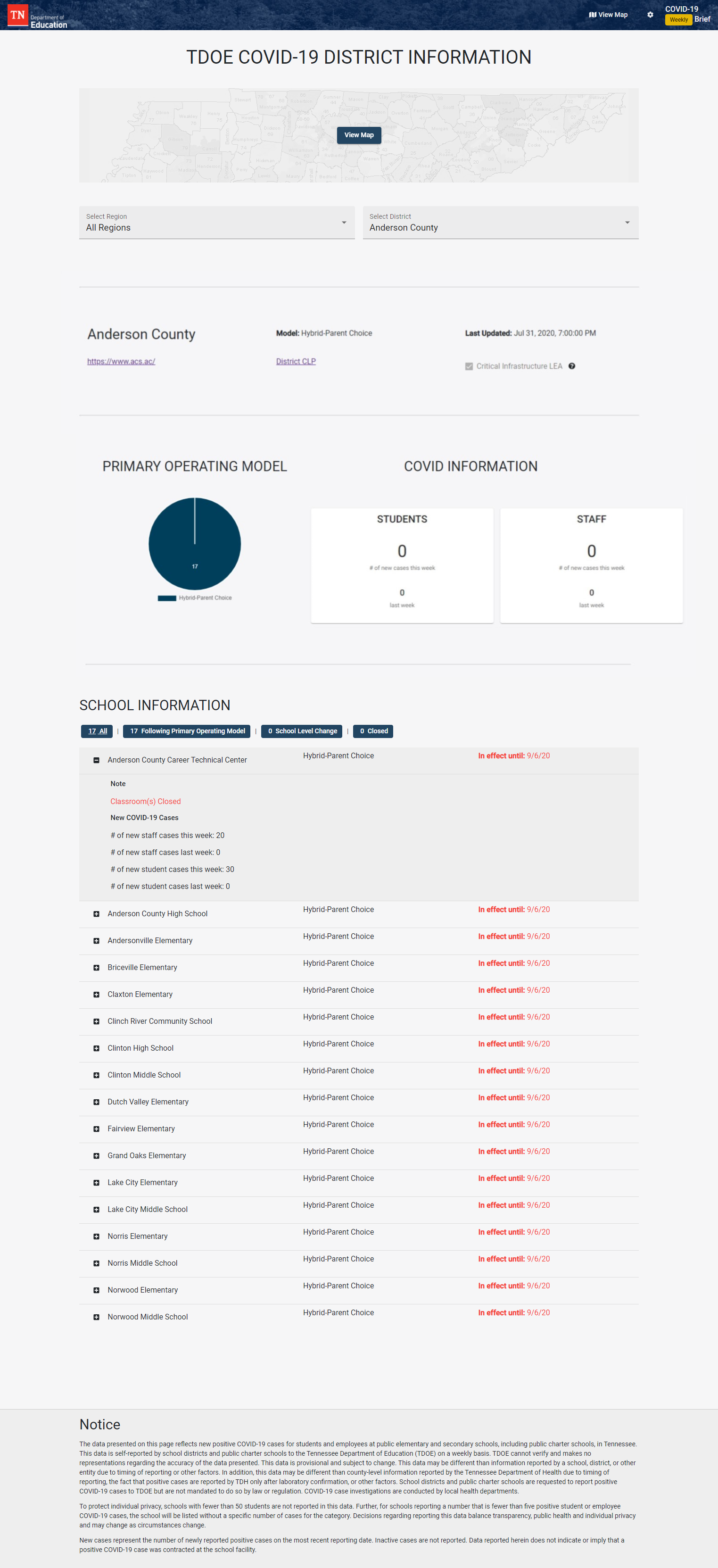 Next week, as the final two districts in the state begin the new school year, a new dashboard will launch on the department’s website that will display information reported by districts about COVID-19 in their communities, and whether or how positive cases within a school may impact the way teachers deliver instruction to students, according to a news release from Victoria Robinson, spokesperson for TDOE.
