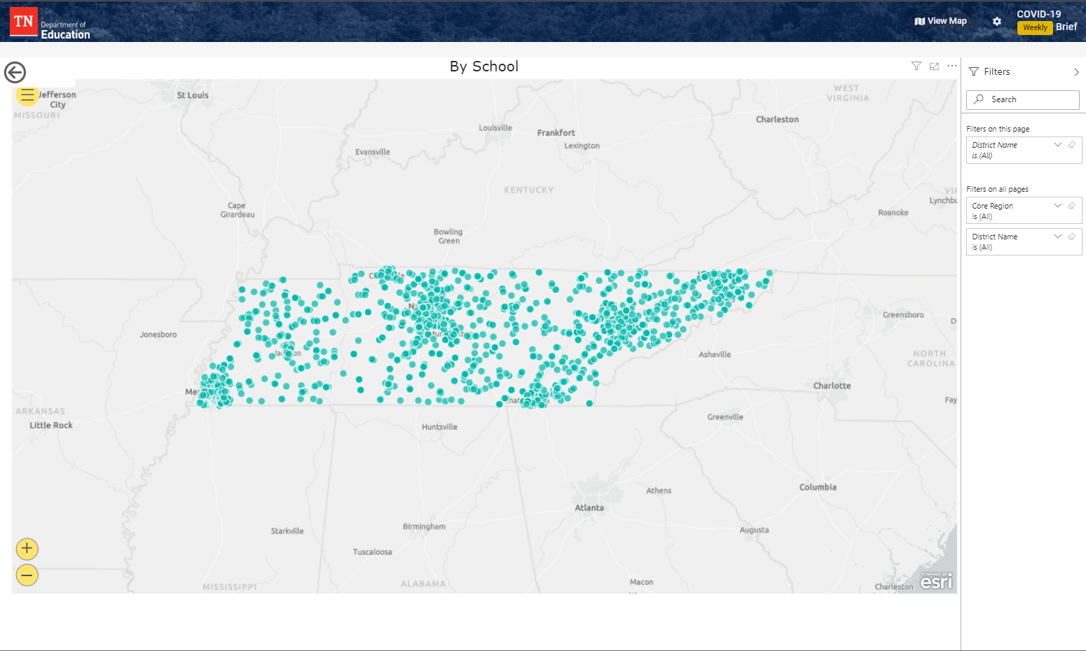 - A map view— An interactive map of the state of Tennessee will enable users to hover over their county or region and select their school to reveal more information.