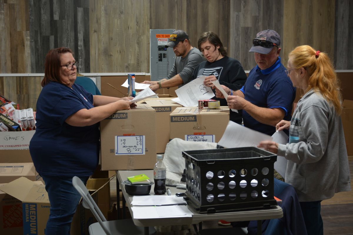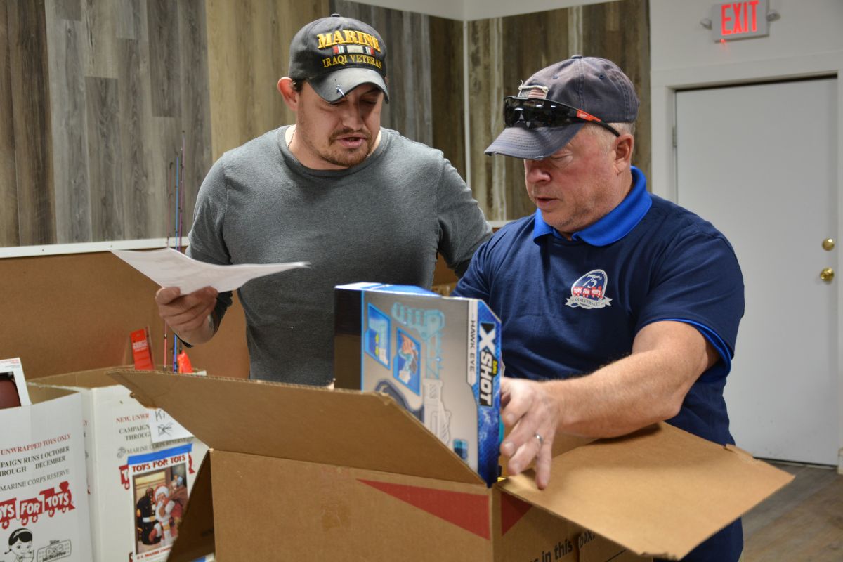 Toys for Tots volunteers fill holiday family boxes with donated toys and gifts for children at Christmas on, Nov. 28, 2022. (Lee Erwin).