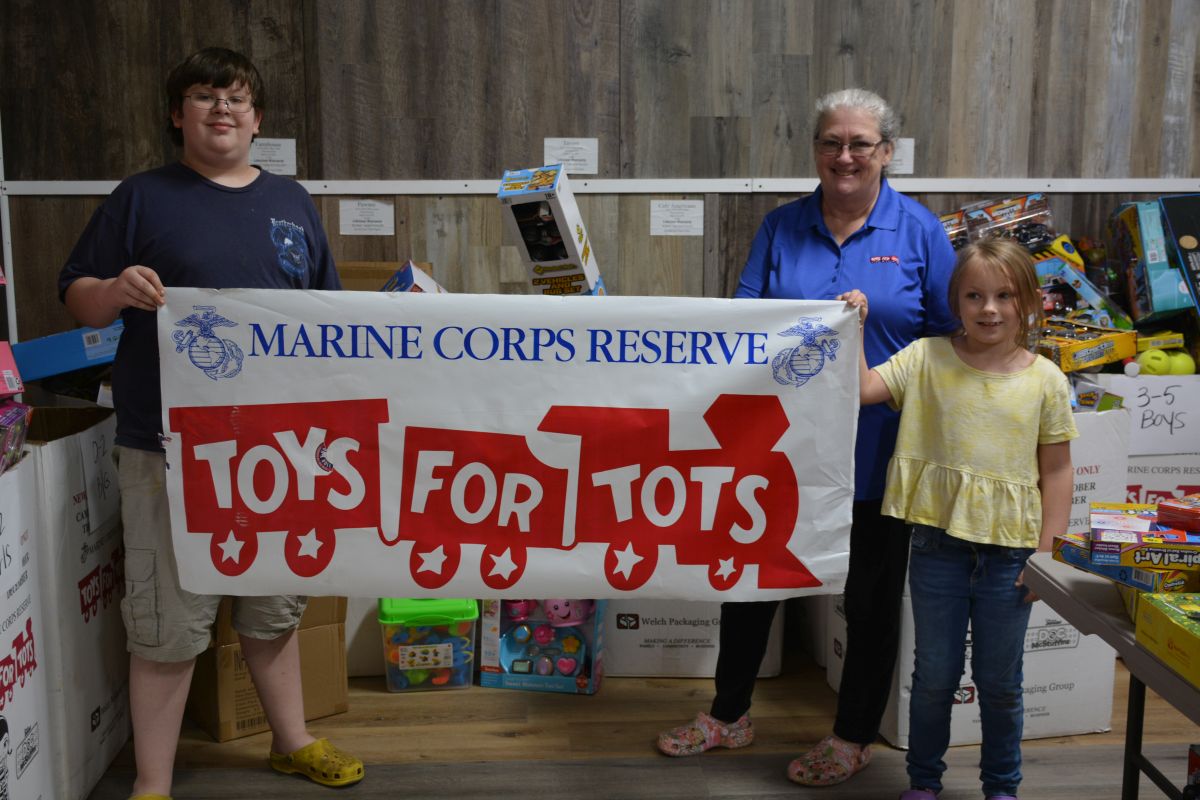 Silas Meives, Jo Kohler, and Savannah Meives, show off the Toys for Tots banner while filling holiday family boxes with donated toys and gifts for children at Christmas on, Nov. 25, 2022. (Lee Erwin).