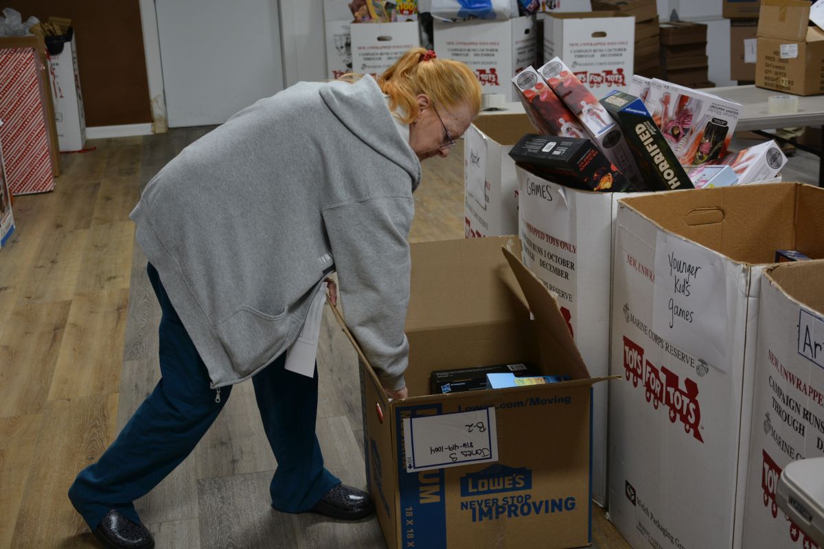 A Toys for Tots volunteer fills holiday family boxes with donated toys and gifts for children at Christmas on, Nov. 28, 2022. (Lee Erwin).