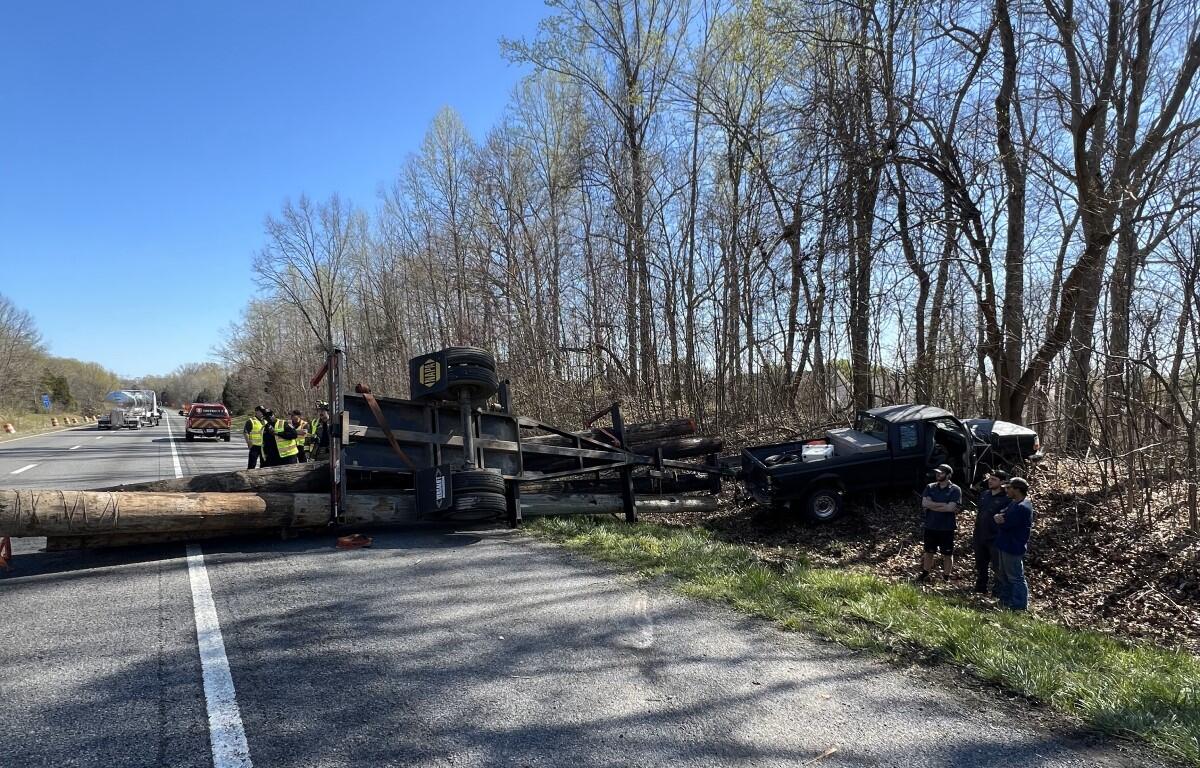 At 2:56 p.m., a pickup truck hauling used telephone poles went off the interstate at mile marker 12, according to Clarksville Fire Rescue Assistant Chief Michael Rios. There were no injuries.