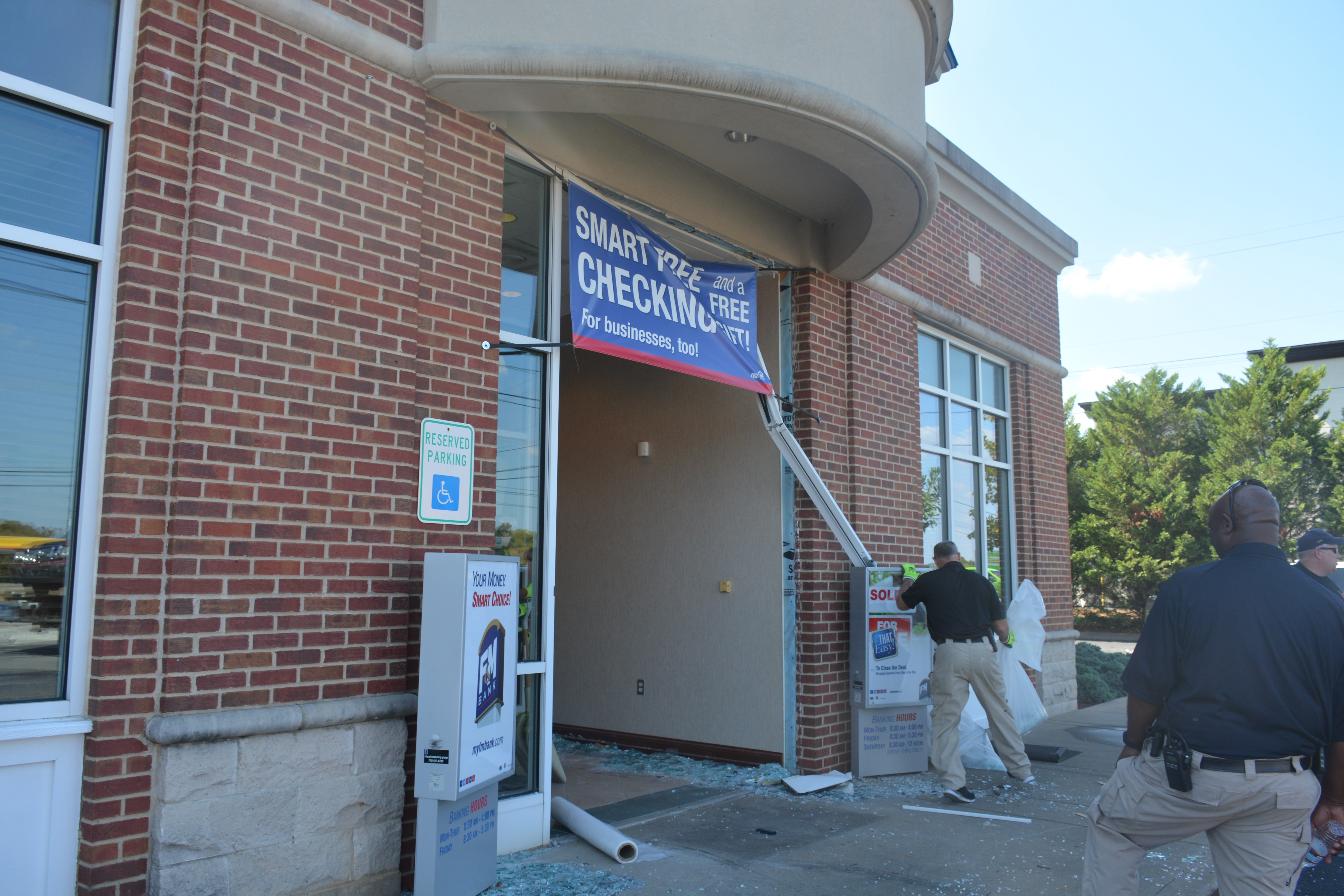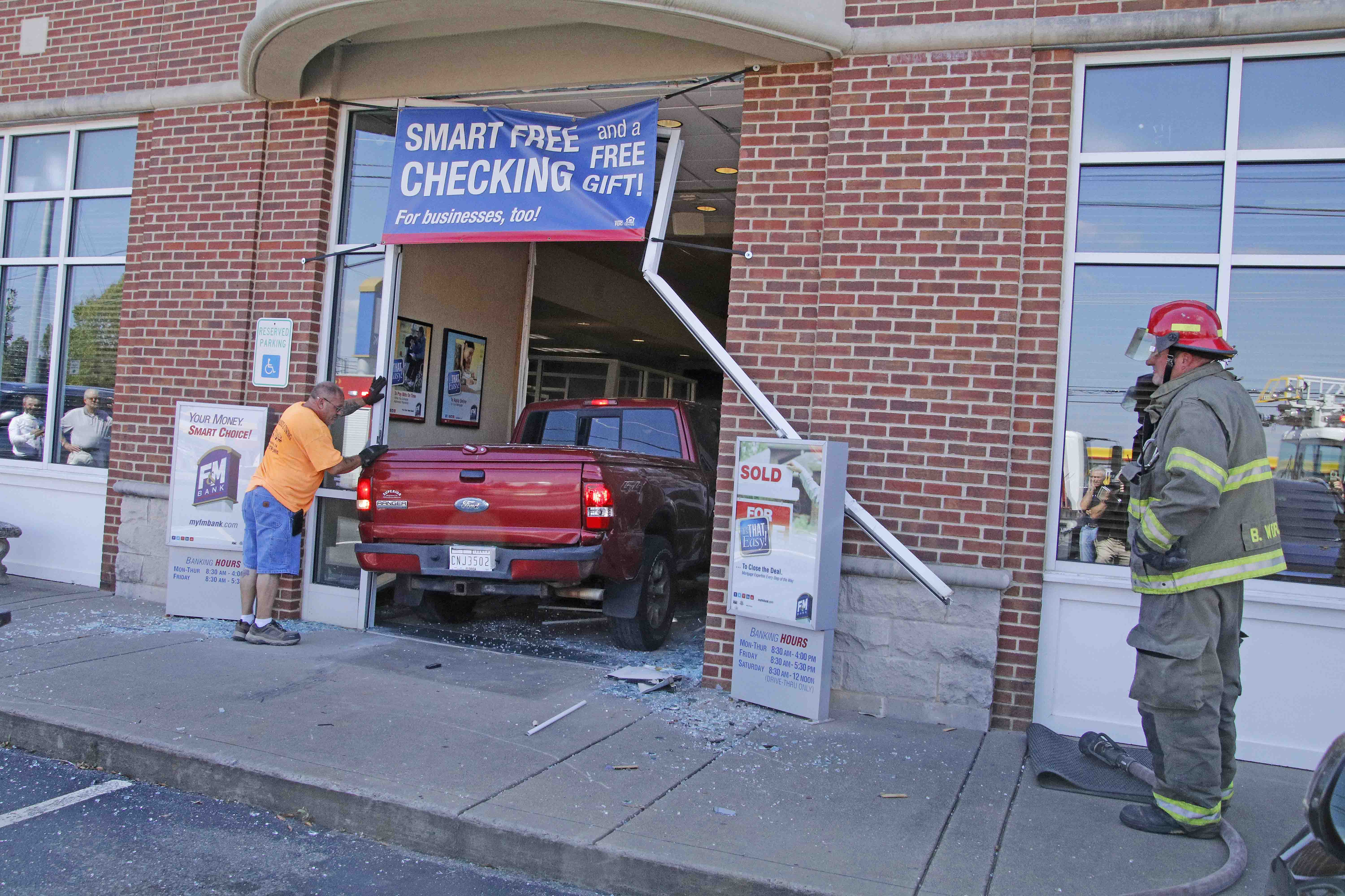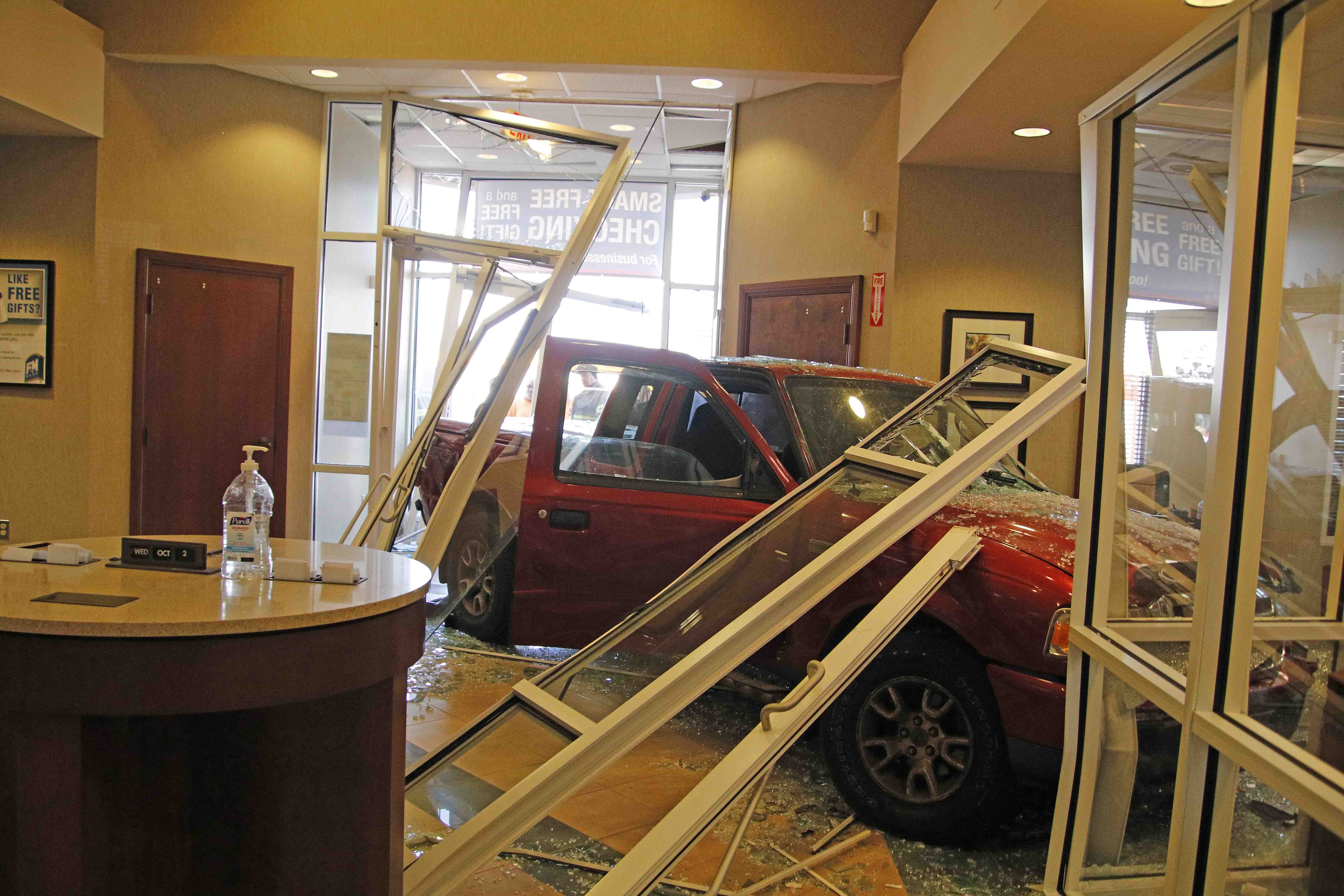 Police and EMS were on the scene at F&M Bank at the intersection of Highway 41 and Excell Road after a red Ford Ranger collided with the building’s front entrance, spreading glass throughout the parking lot and the building’s interior.