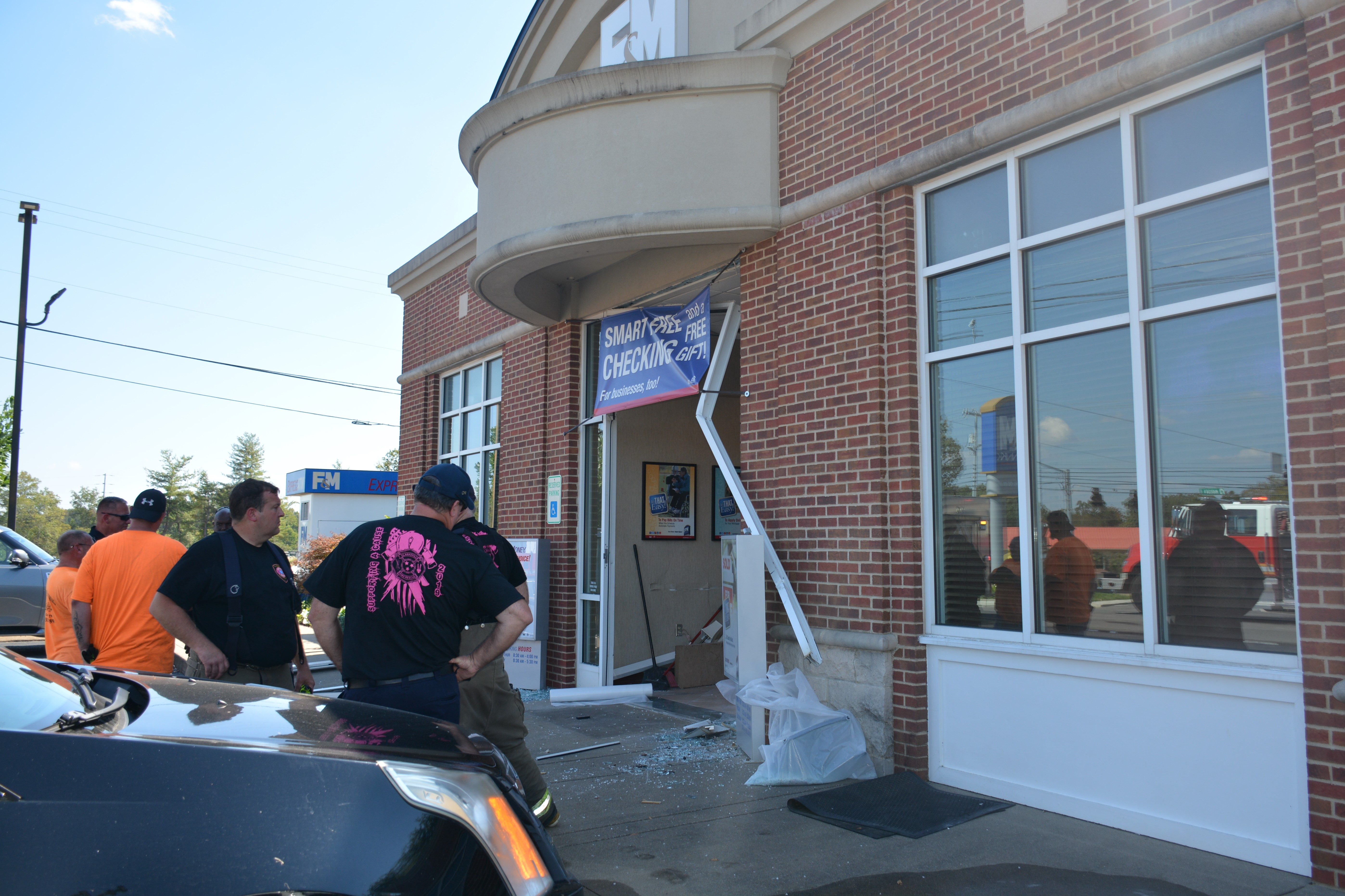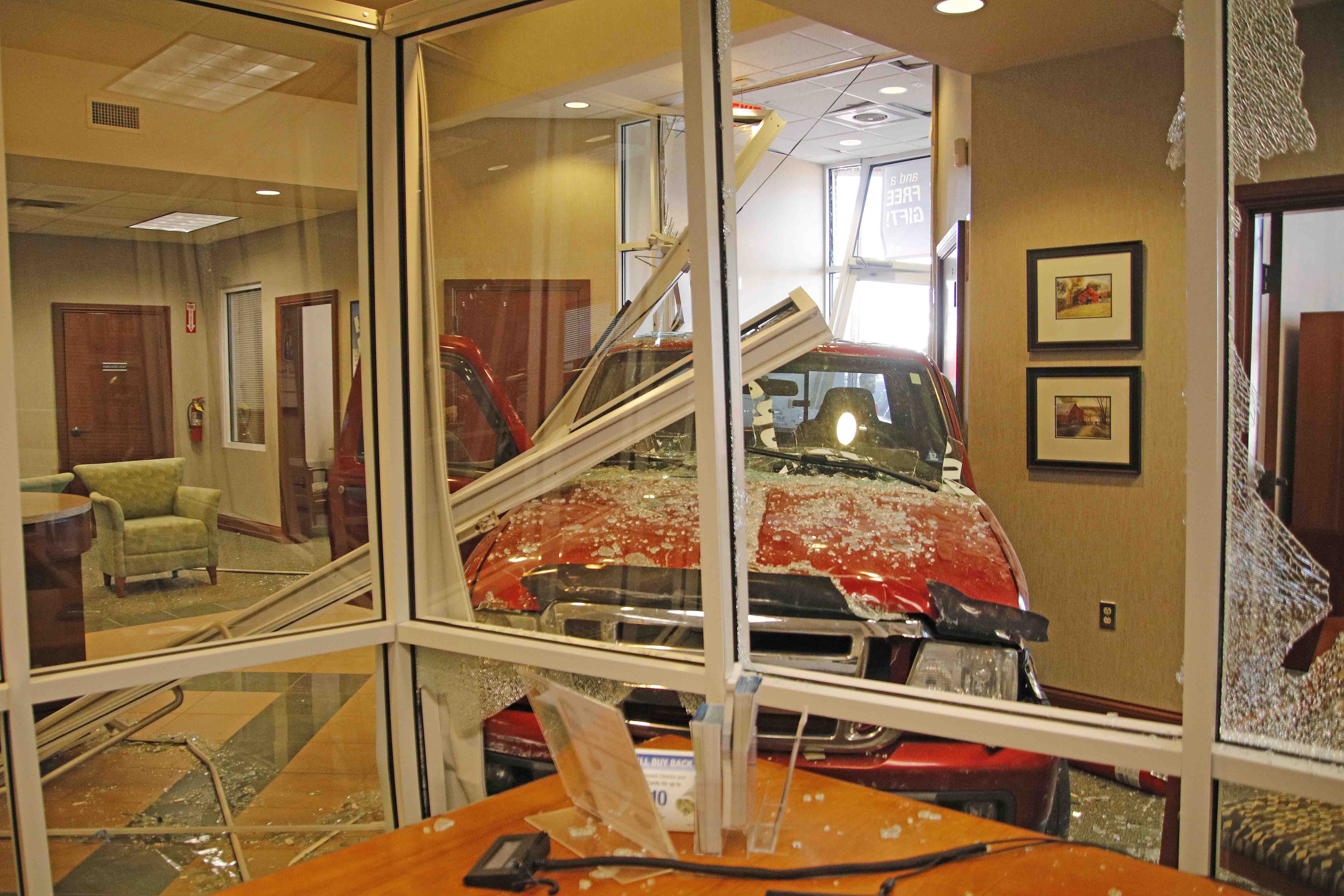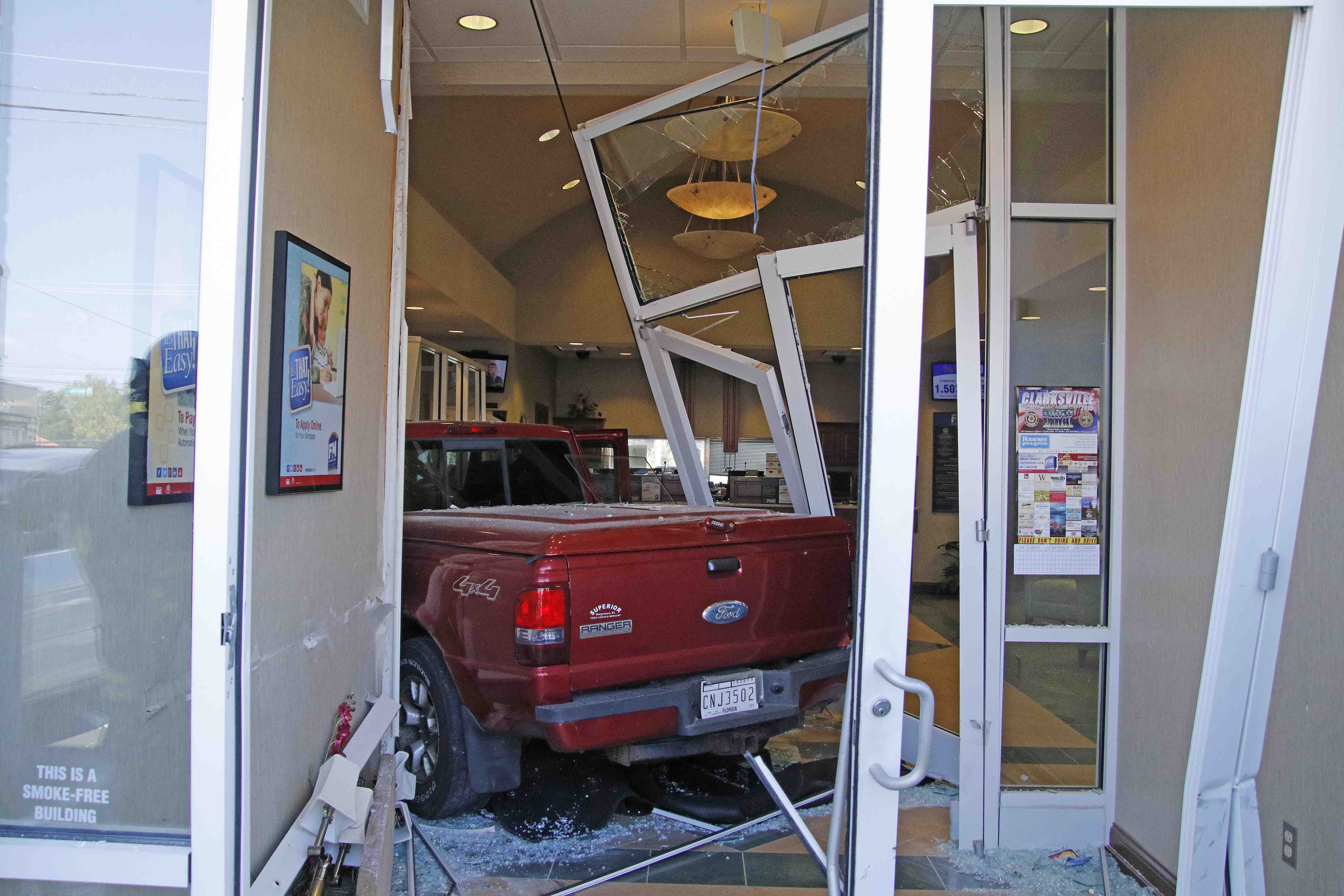 Police and EMS were on the scene at F&M Bank at the intersection of Highway 41 and Excell Road after a red Ford Ranger collided with the building’s front entrance, spreading glass throughout the parking lot and the building’s interior.