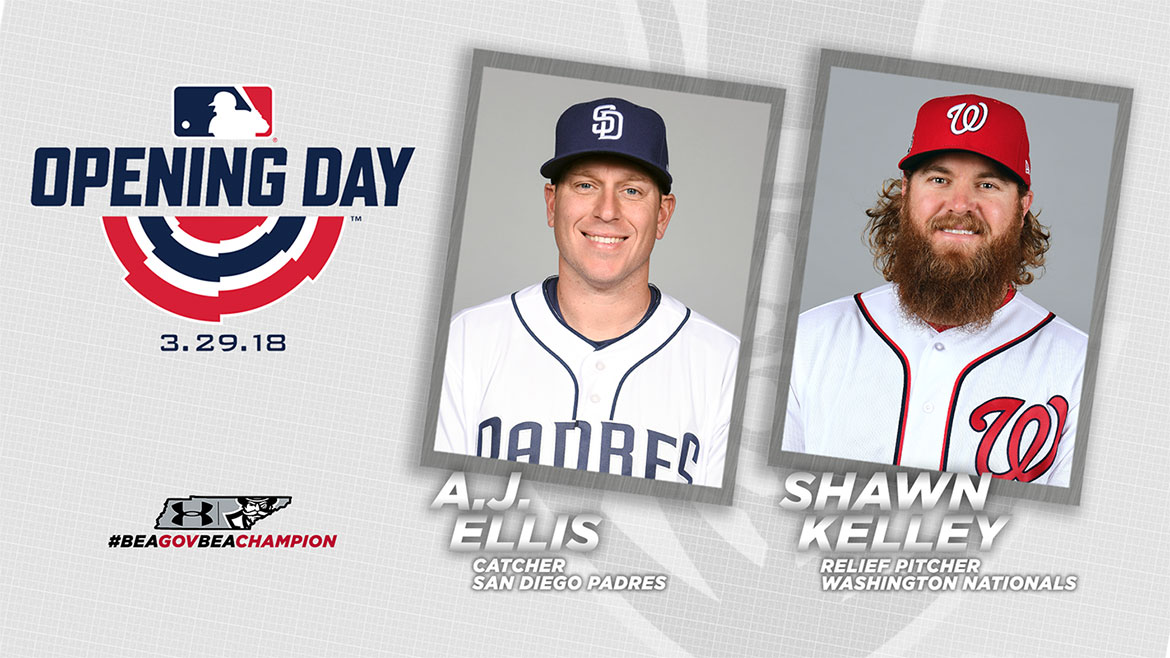 A.J. Ellis and Shawn Kelley, Austin Peay State University baseball alumni, each are a member of 2018 Opening Day Rosters for the San Diego Padres and Washington Nationals, respectively, as the Major League Baseball season begins, Thursday.