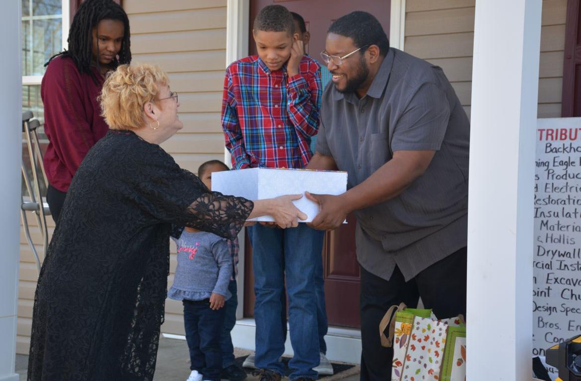 Other community supporters of Habitat shared gifts with both families. Dee Anderson with Daughters of the American Revolution (DAR) presented a DAR Home Library, Kay Jay with the Clarksville Quilt Posse donated a quilt, and Margaret Pace with the Master Gardner’s presented a tree which represents putting down roots and future growth.