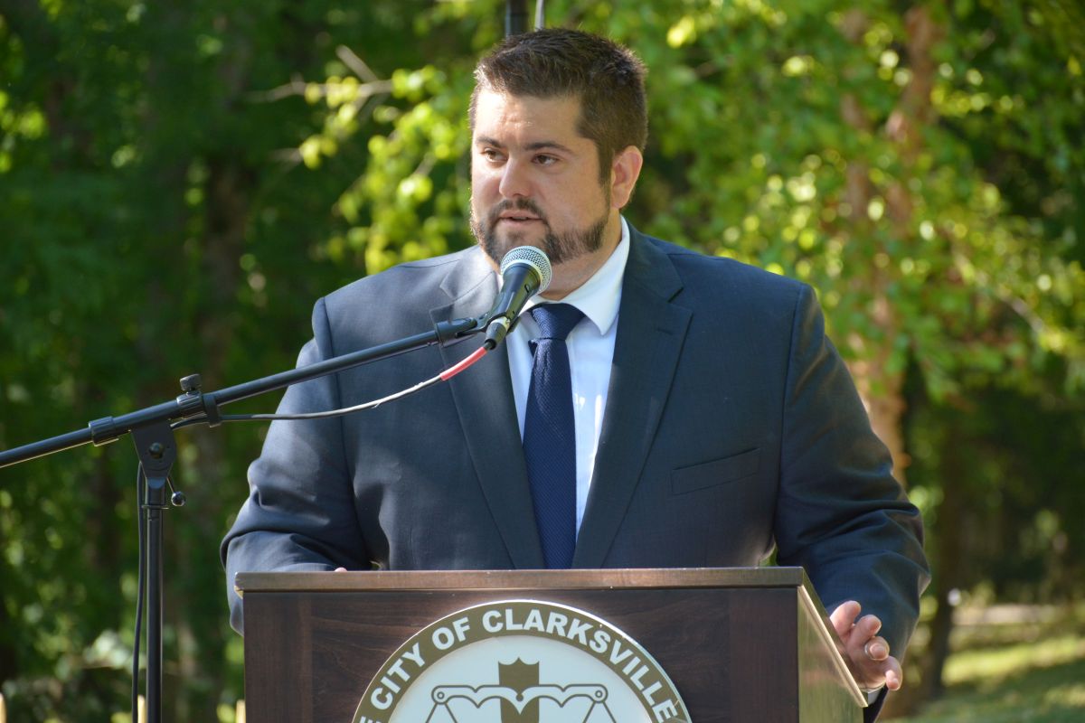 Clarksville Mayor Joe Pitts speaking at the Mt. Olive Cemetery Historical Preservation Society, U.S. Colored Troops Monument Unveiling Ceremony at Fort Defiance Civil War Park & Interpretive Center on, June 18, 2022. (Lee Erwin)