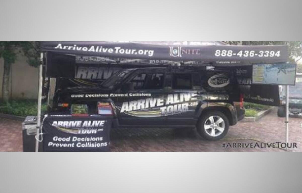 The Arrive Alive Tour uses a high-tech, state-of-the-art simulator that allows participants to drive while distracted, drunk or drugged in a fully functioning vehicle without moving or being intoxicated. The simulator allows participants to experience the real-life dangers without the real-life consequences.