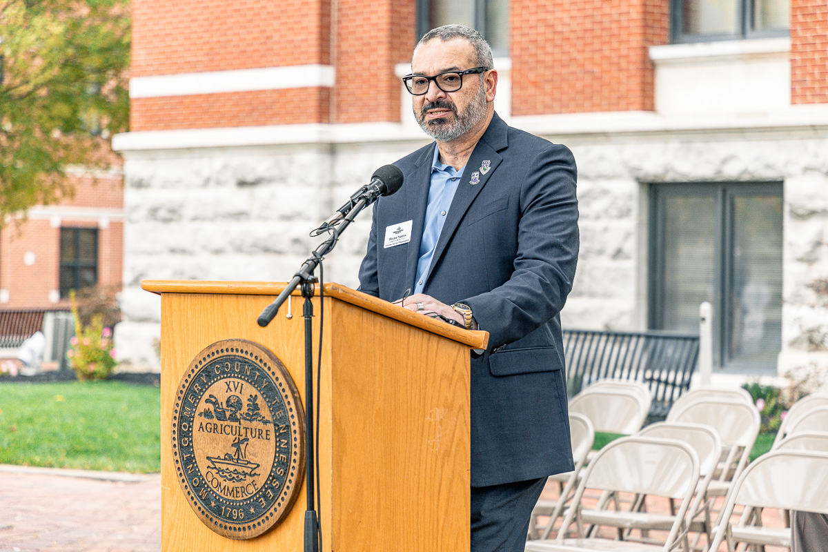 Andrew Kester, retired U.S. Army first sergeant and Montgomery County’s director of Continuous Improvement, spoke about the history of the Veterans Service Organization. “We’re here today to recognize 80 years of service,” Kester stated, explaining that the VSO began in 1944 as the Ex-Servicemen’s Bureau to support veterans and their families after World War II. Today, it is the largest VSO in Tennessee, serving over 34,000 veterans.