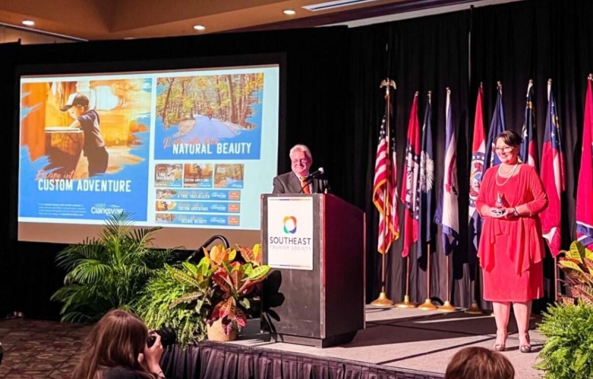 CLARKSVILLE, TN – Visit Clarksville was recognized for its 2021 Fall Travel marketing campaign at the Southeast Tourism Society’s annual Connections conference in Concord, North Carolina on Sept. 8. The Visit Clarksville marketing team and its director, Michelle Dickerson, were honored with the Best Marketing Shining Example Award in their budget category (II).