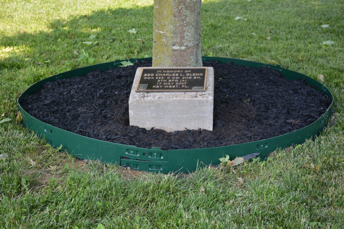The base of one of the memorial trees and a plaque honoring a 5th Special Forces Group fallen hero at Gabriel Field on Fort Campbell, on May 12, 2022 (Lee Erwin)