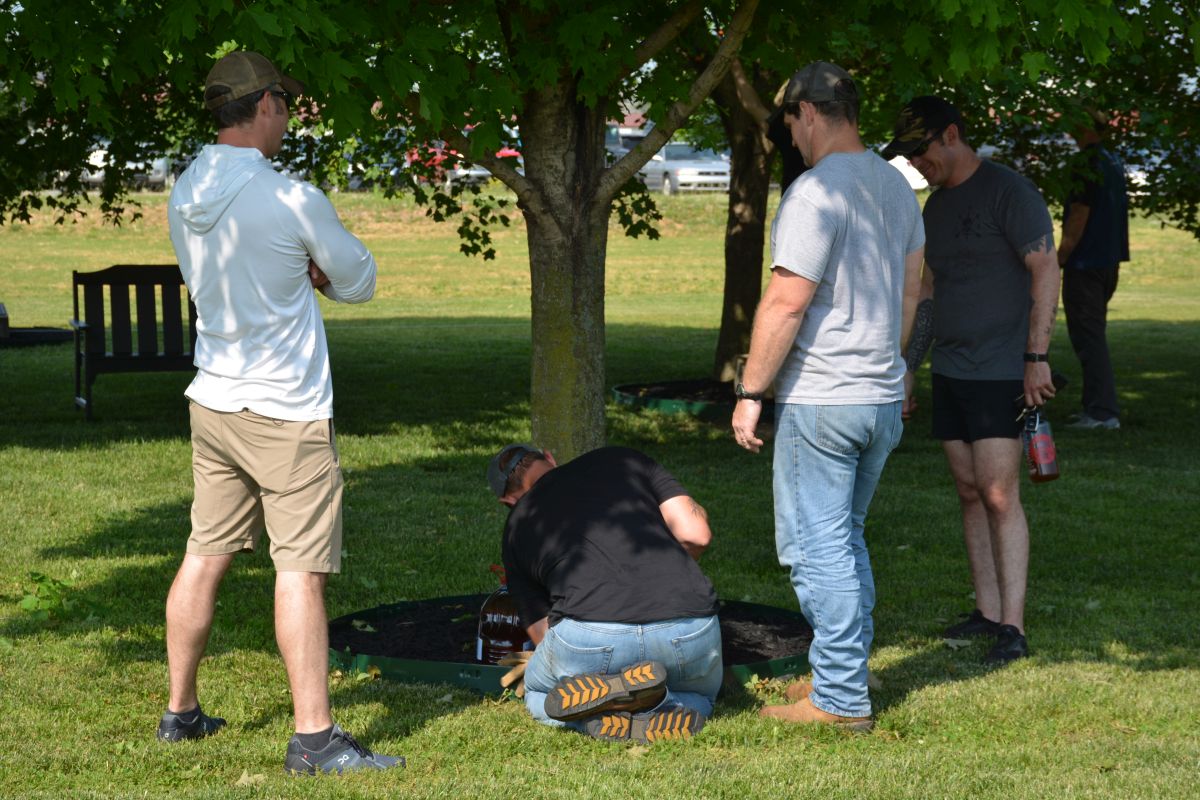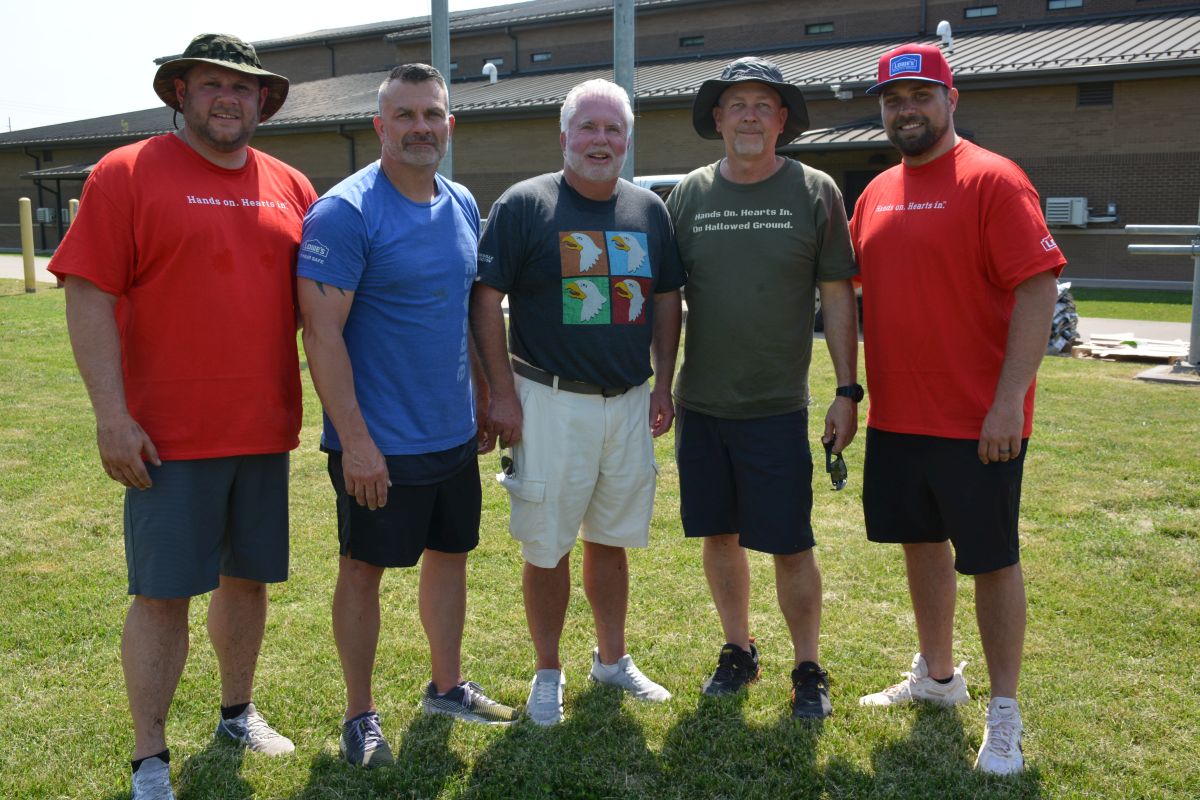 Paul Richardson, Paul Jones, Nathan Clark, Doug Graves, $ Corey Mayo, volunteering at Gabriel Field on Fort Campbell to spruce up the site for the 5th Special Forces Group (Airborne) and their upcoming Memorial Day Ceremony, May 12, 2022 (Lee Erwin)