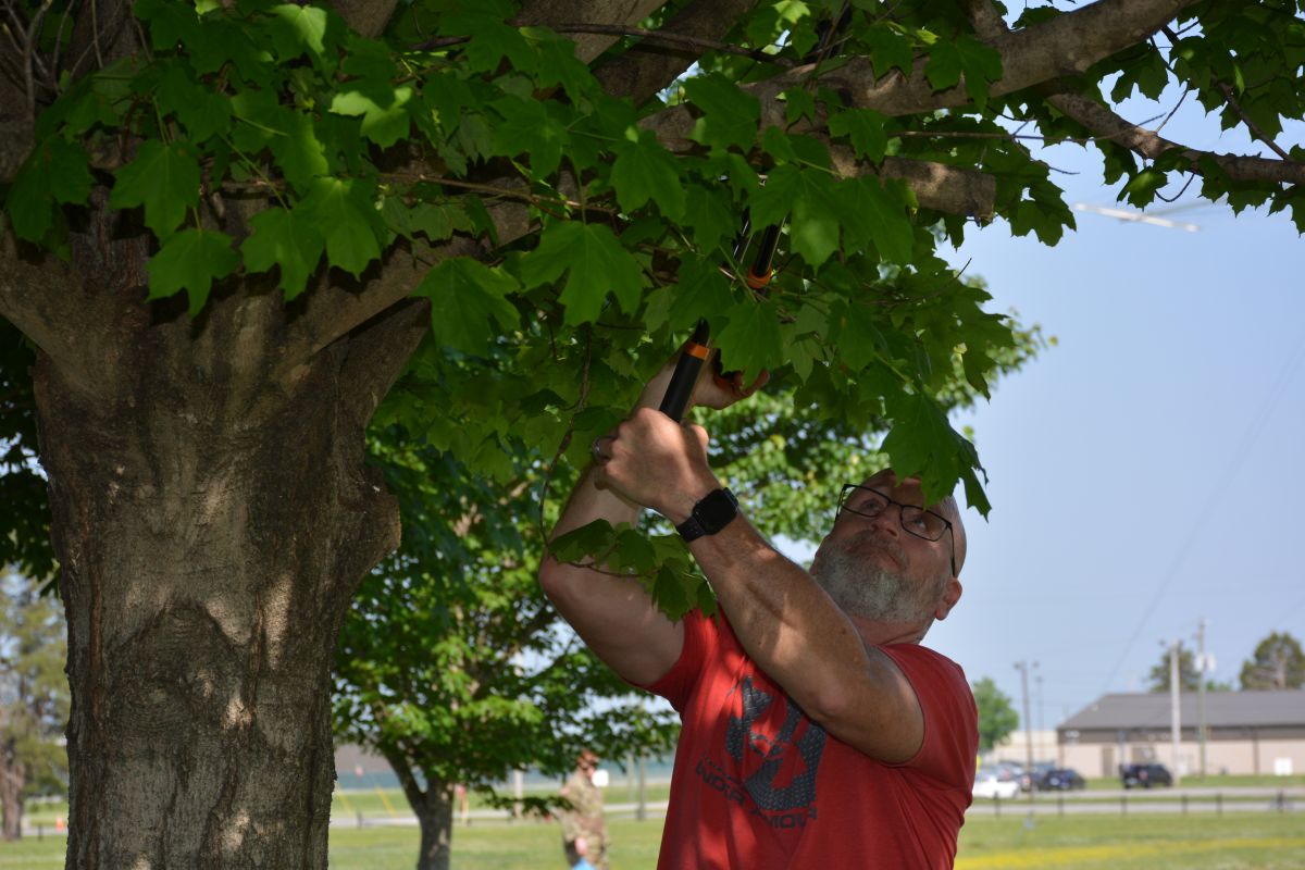 A volunteers works at Gabriel Field on Fort Campbell to spruce up the site for the 5th Special Forces Group (Airborne) and their upcoming Memorial Day ceremony, May 12, 2022 (Lee Erwin)