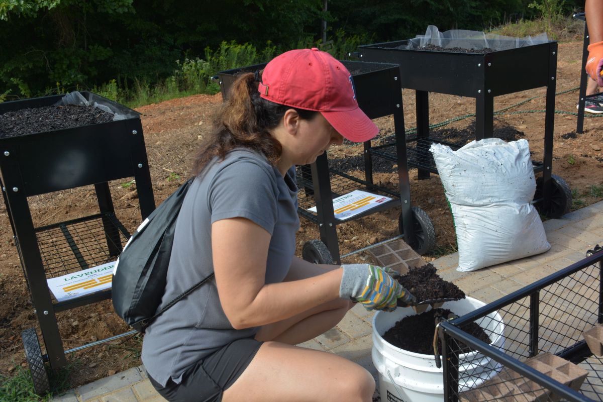 A volunteers helps with the planting of herbs and crops at the Montgomery County Community Garden in Rotary Park on, Sep. 3, 2022. (Lee Erwin).