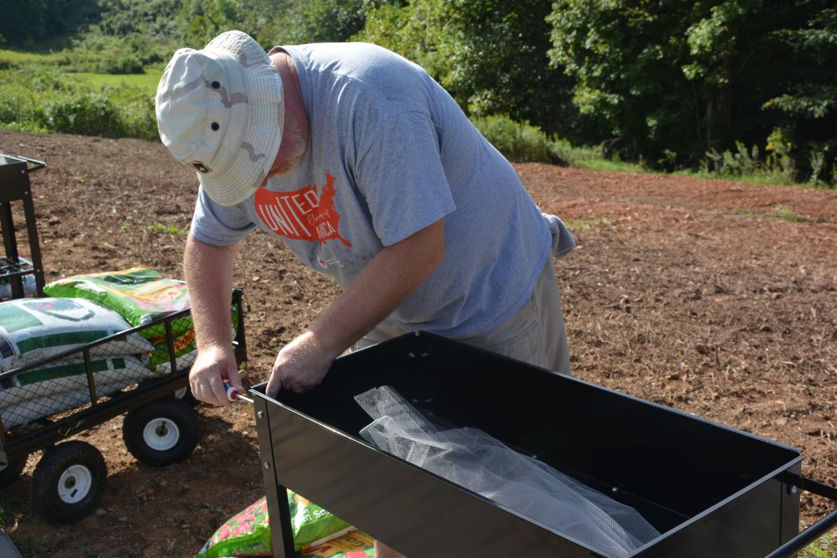 A volunteer helps with the assembly of a raised garden bed at the Montgomery County Community Garden in Rotary Park on, Sep. 3, 2022. (Lee Erwin).
