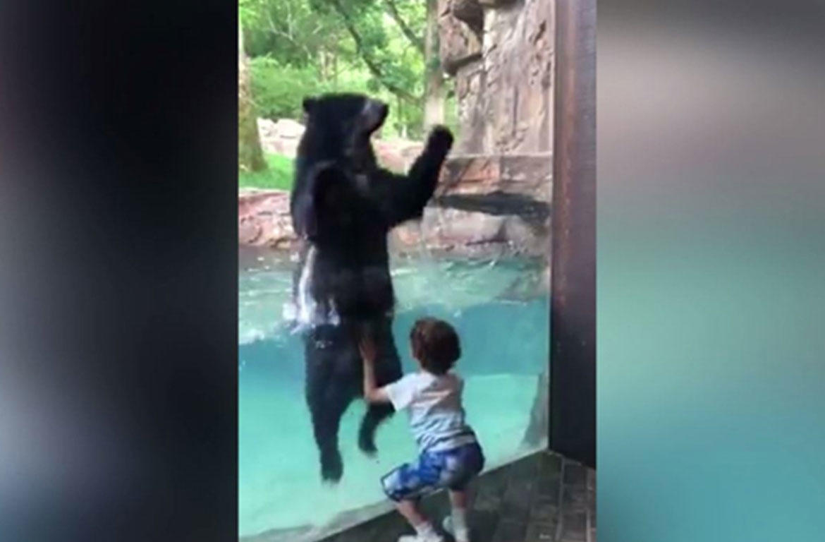 While visiting the exhibit, Ian started jumping in front of the glass separating him from the bear when it jumped into the water.