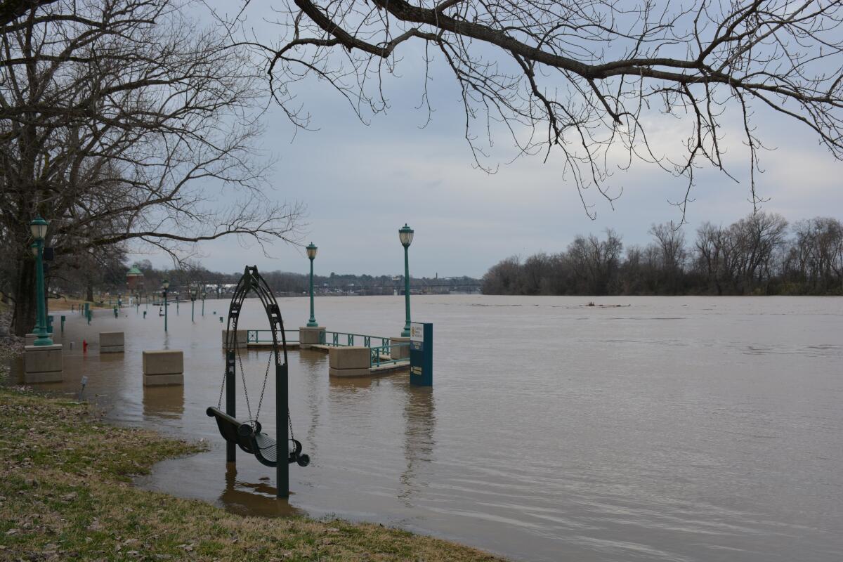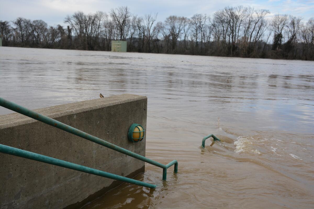 At 11 a.m. Monday, the stage was 45.79 feet and rising. Flood stage is 46.0 feet. The river is expected to crest near 48.4 feet Tuesday morning. It will then fall below flood stage early Wednesday.