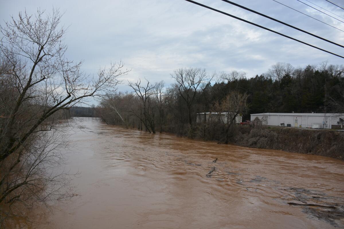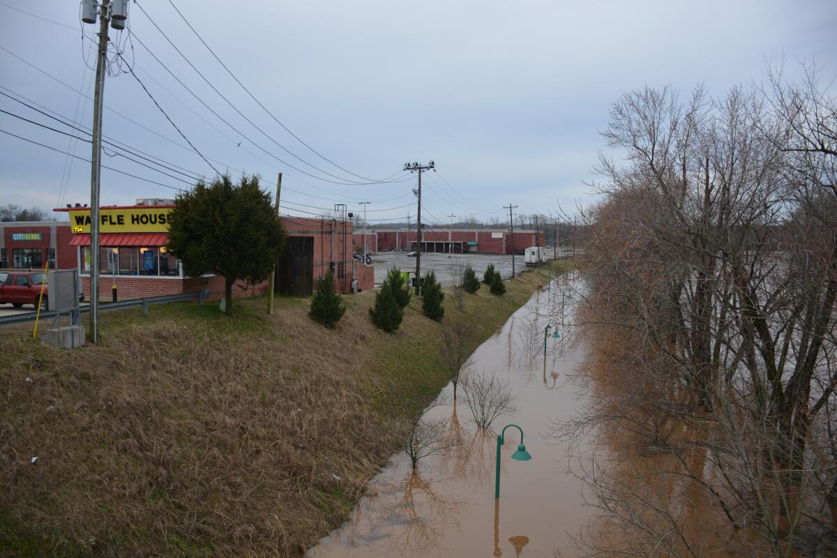 At 43.0 feet, water inundates low lying areas of industrial property on Zinc Plant Road. Water also backs up adjacent tributaries, including Bartons Creek, Red River, West Fork Red River and Yellow Creek.