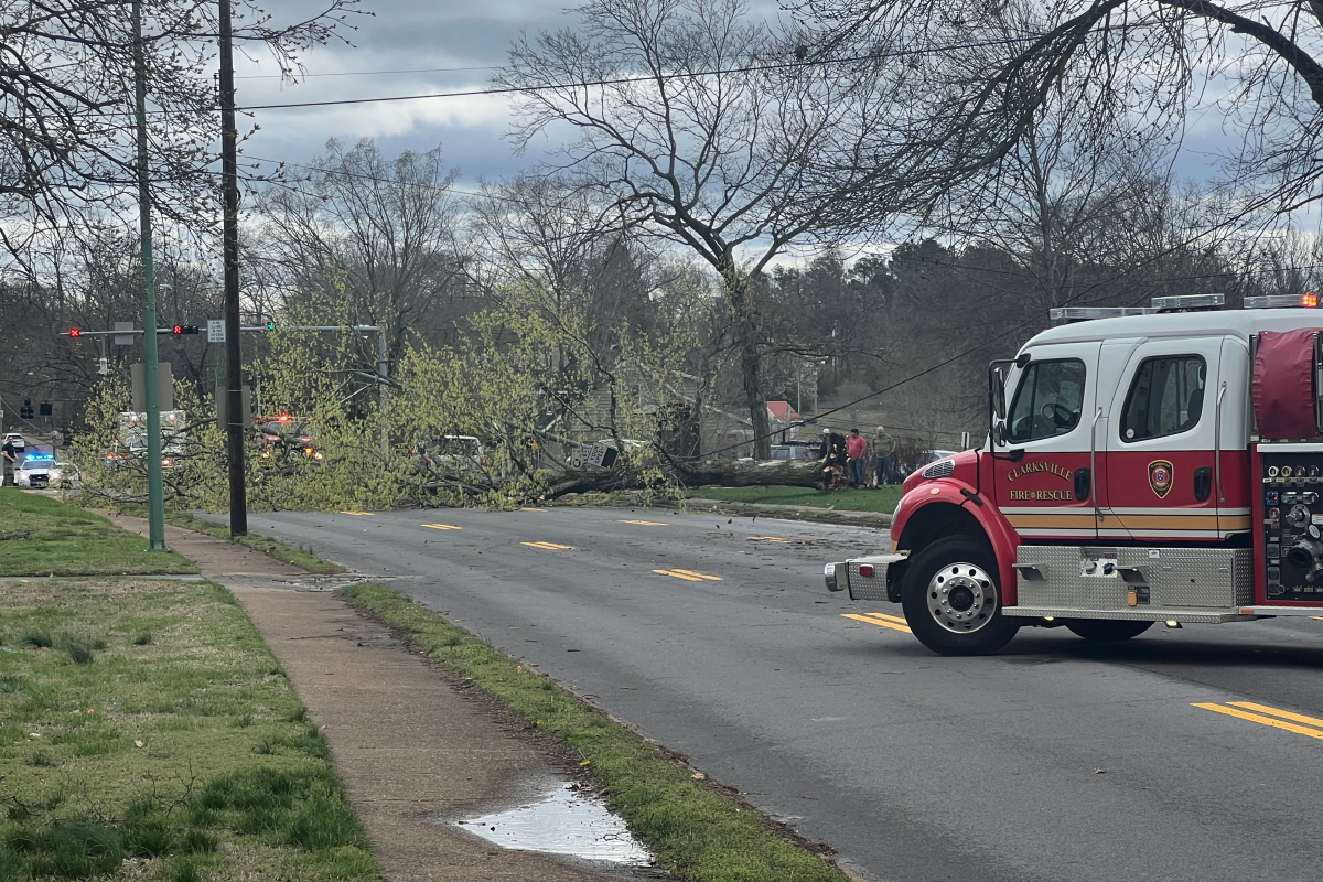 Clarksville Fire Rescue units are among the crews responding to the downed power lines and trees at multiple locations around town. “Be careful of down power lines and always assume that they are charged and very dangerous,” CFR said.