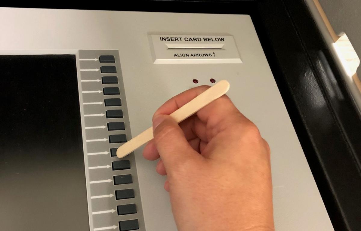 When they enter, each voter will be given a pen for registration that they will keep and a popsicle stick, called a craft stick, to use to make their choices on the voting machine so they will not have to use their fingers.