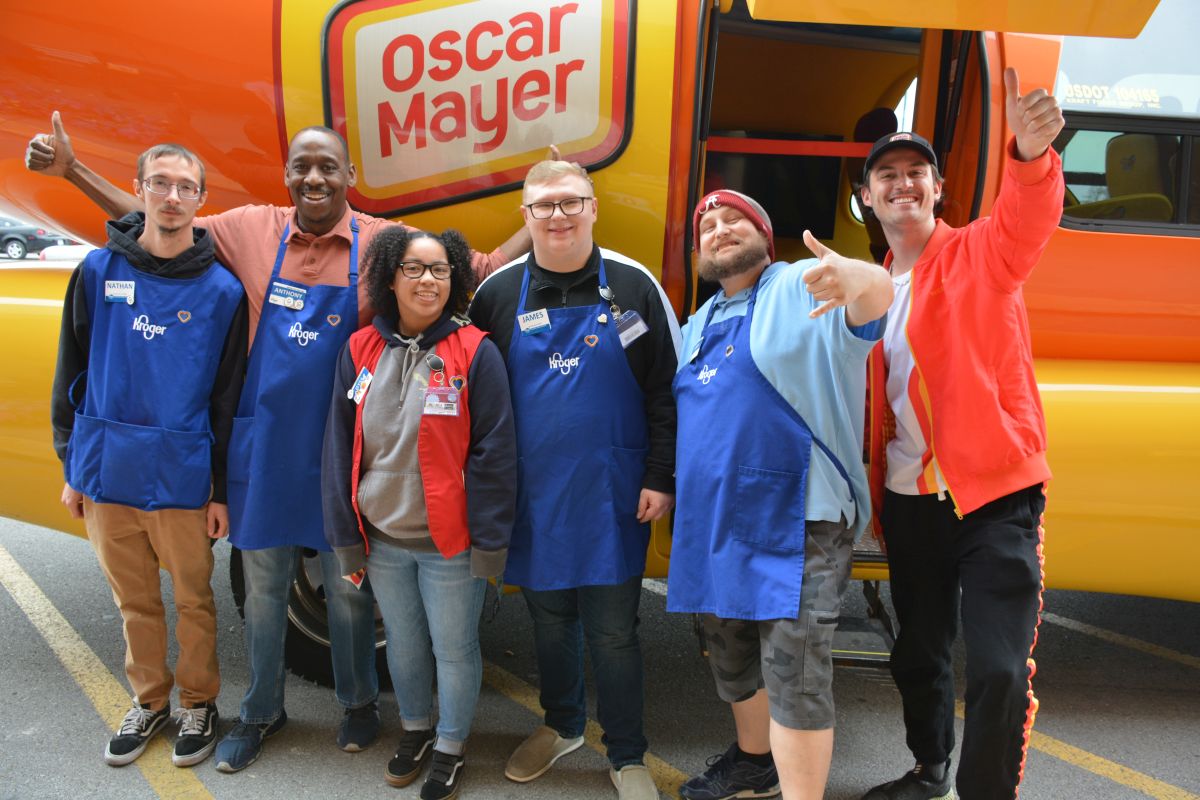 Kroger employees at Dover Crossing join Bun Man Bran, for a photo beside the Oscar Mayer Wienermobile, on Apr. 20, 2022. (Lee Erwin).