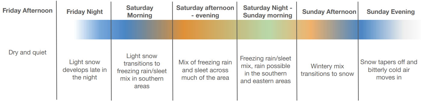“Snow will mix with freezing rain, rain, and sleet Saturday afternoon into Sunday morning,” the NWS said. “Expect power outages and tree damage due to the ice. Travel could be impossible.”