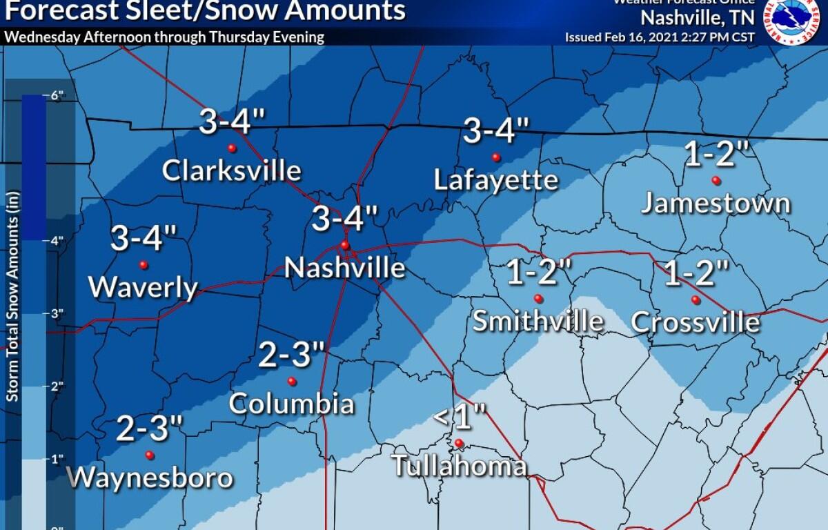 “Light snow is possible tomorrow morning across the northwest (of Middle Tennessee), but the bulk of accumulations start tomorrow night into Thursday,” according to a National Weather Service alert.
